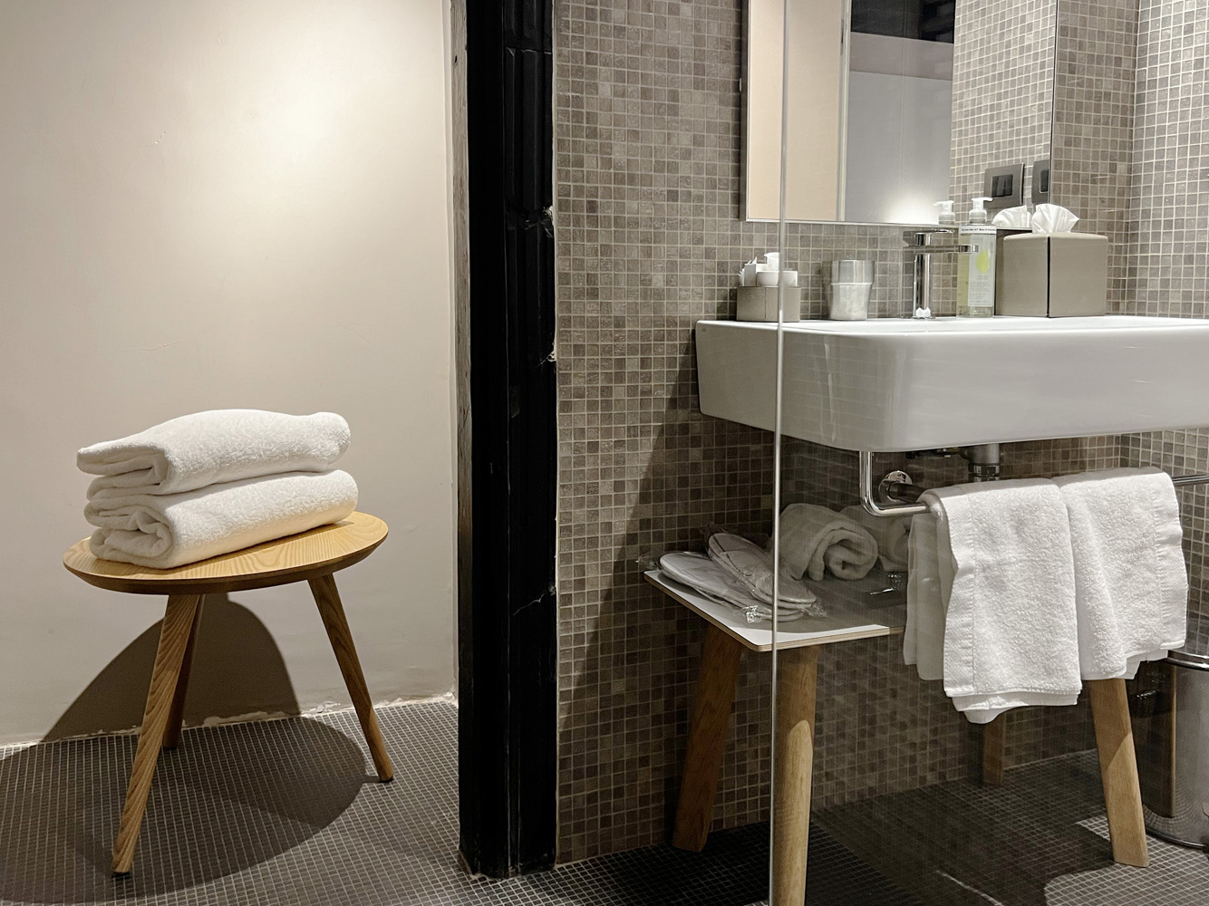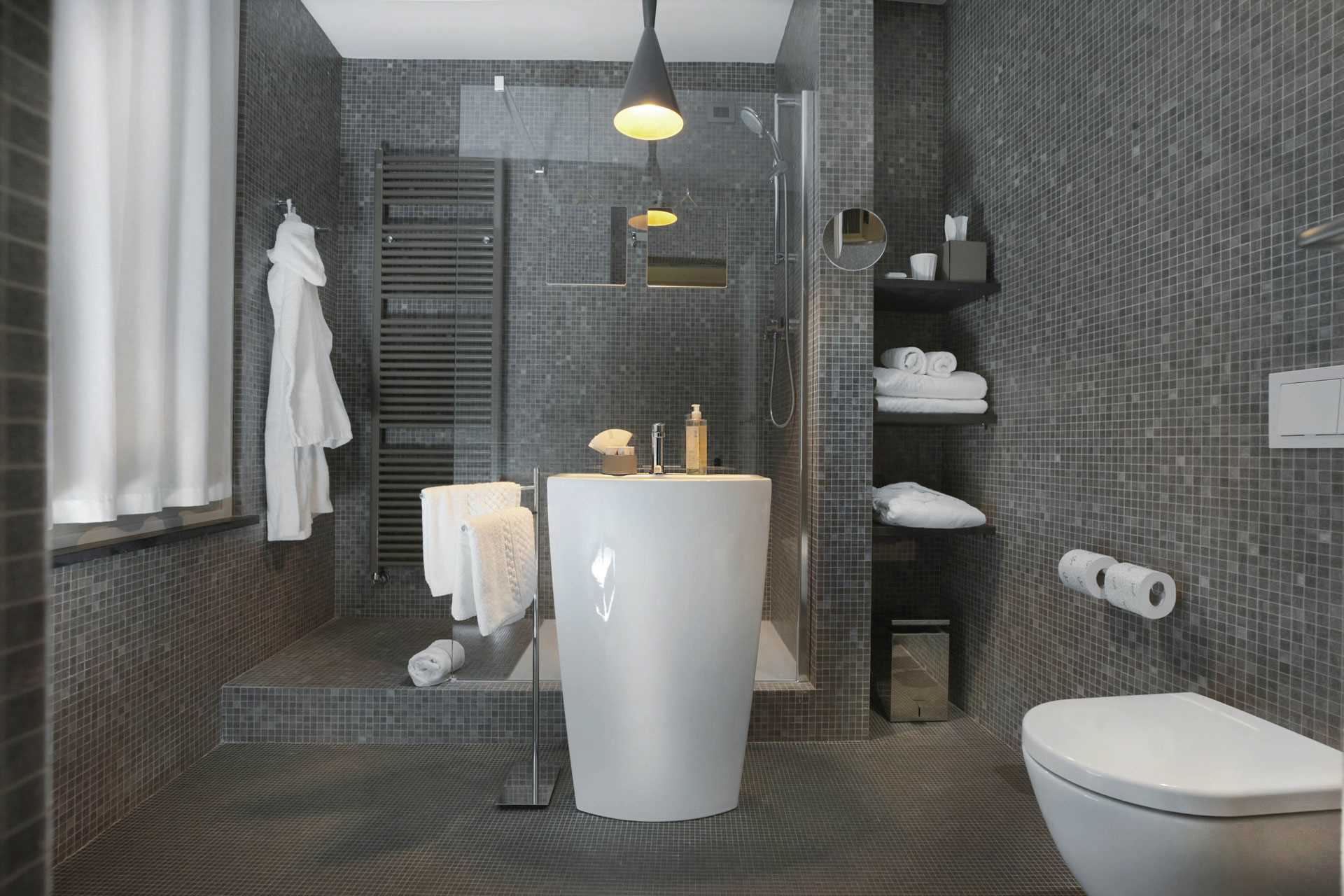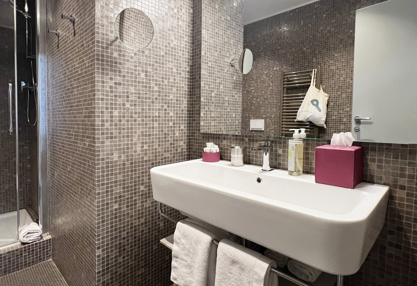 Bagno elegante e ricercato con lavabo stand alone in camera e ampia doccia, prodotti di detergenza Osmè Ecocert a dispenser con extra kit prodotti cortesia monouso e altri a richiesta.