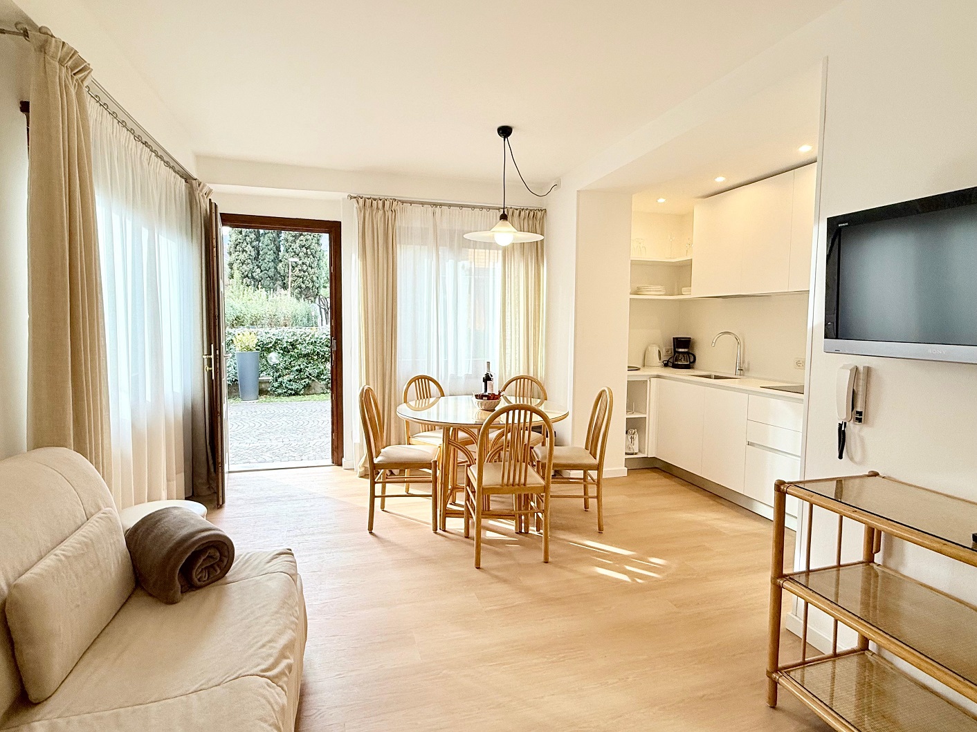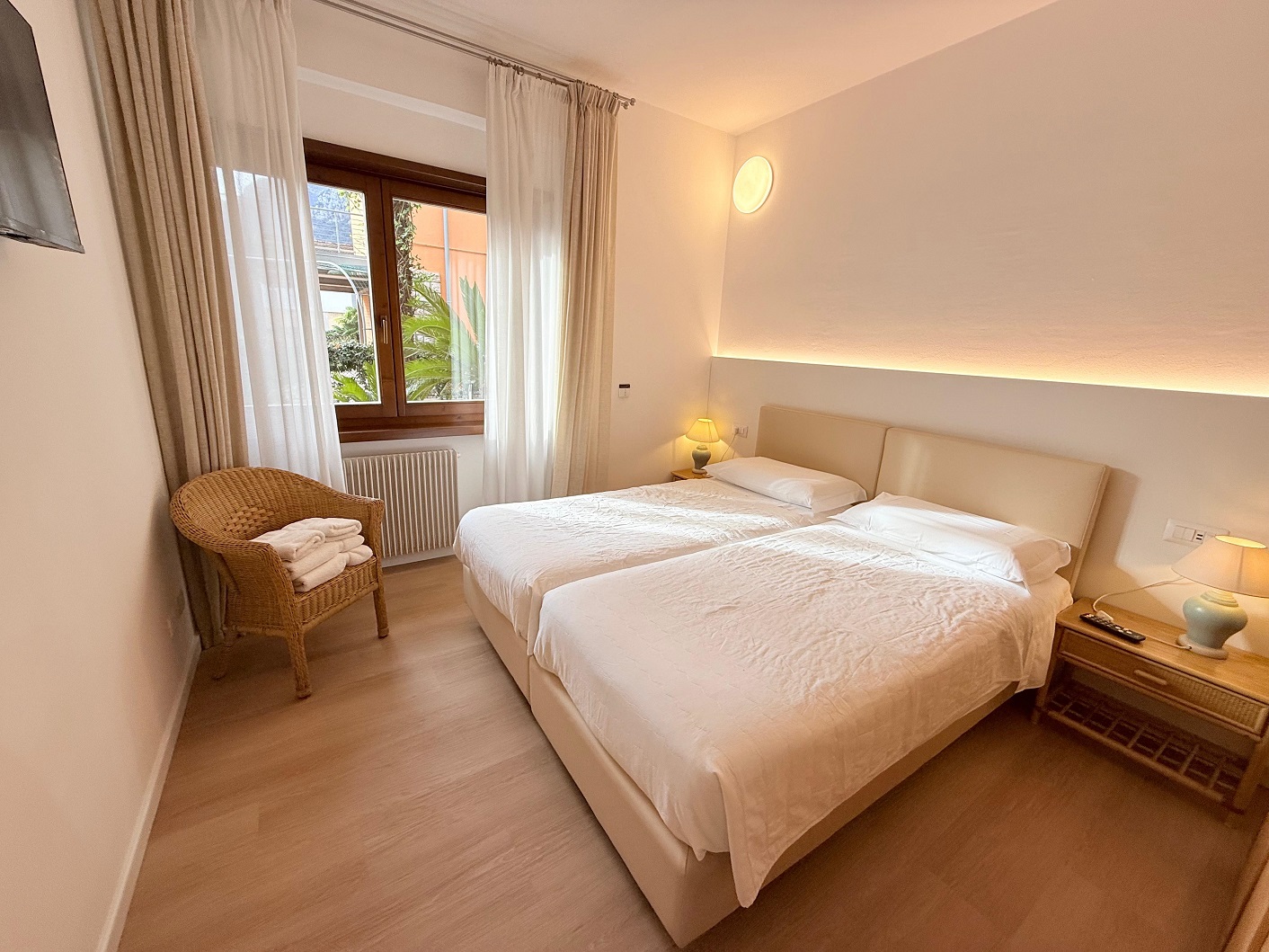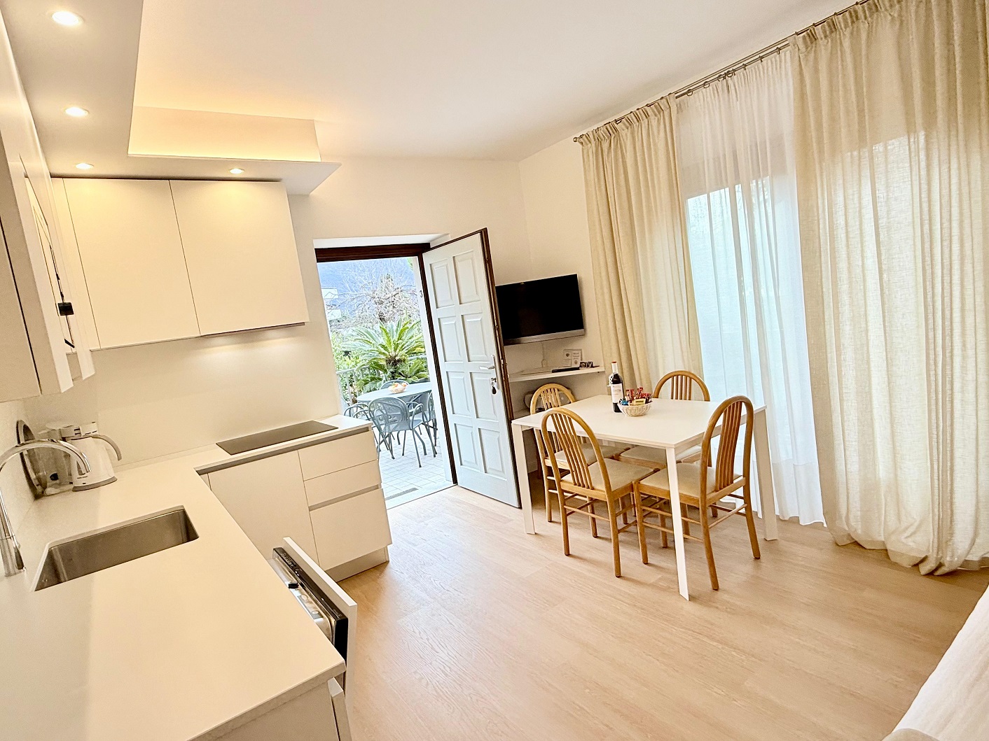 Appartamento (ca. 40m²) situato al piano terra, dotato di una camera con 2 letti singoli oppure 1 matrimoniale, soggiorno/salotto con divano letto per 2 persone, angolo cottura con tutta l’attrezzatura necessaria, lavastoviglie, bollitore e forno microonde, Tv sat HD, bagno con doccia/wc, spazio esterno arredato con tavolo e sedie.