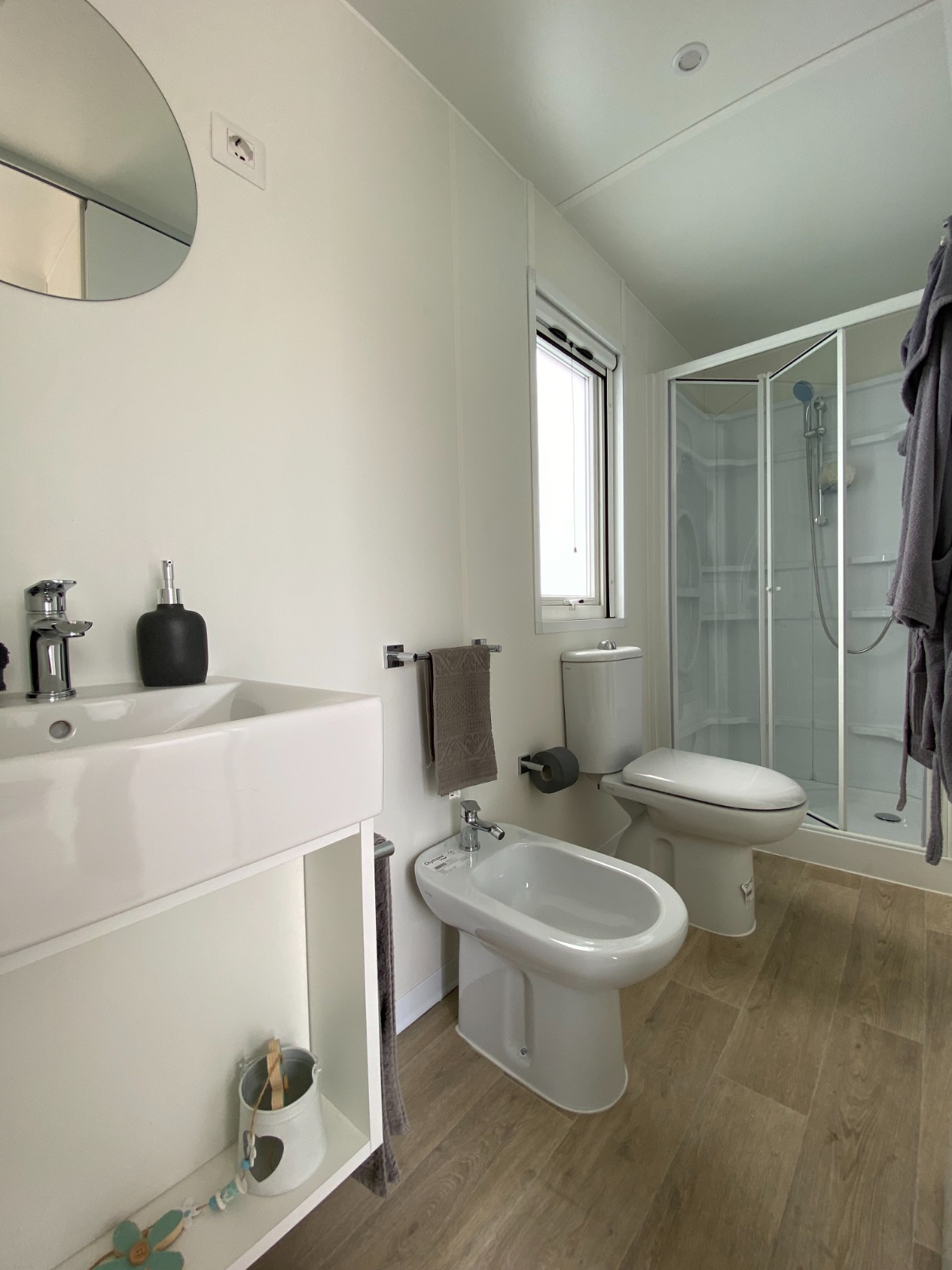 Platz, Komfort und Entspannung für Groß und Klein in einer gemütlichen und hellen Umgebung. Ausgestattete Küche mit 1,5-Personen-Schlafsofa, großem Kühlschrank mit Gefrierfach und überdachter Veranda mit Tisch, Stühlen und Liegestuhl fürs Abendessen oder Entspannen im Freien. Zwei Zimmer mit eigenen Bädern (2 große Duschen, 2 Waschbecken, 2 WC, ein Bidet und ein Föhn). Insgesamt 5 Schlafplätze, Klimaanlage, TV. Perfekt für die Schaffung glücklicher Erinnerungen! 🏖️👪"