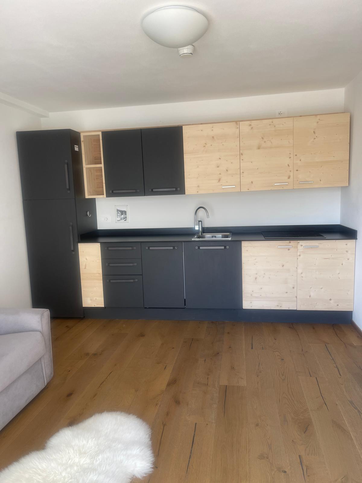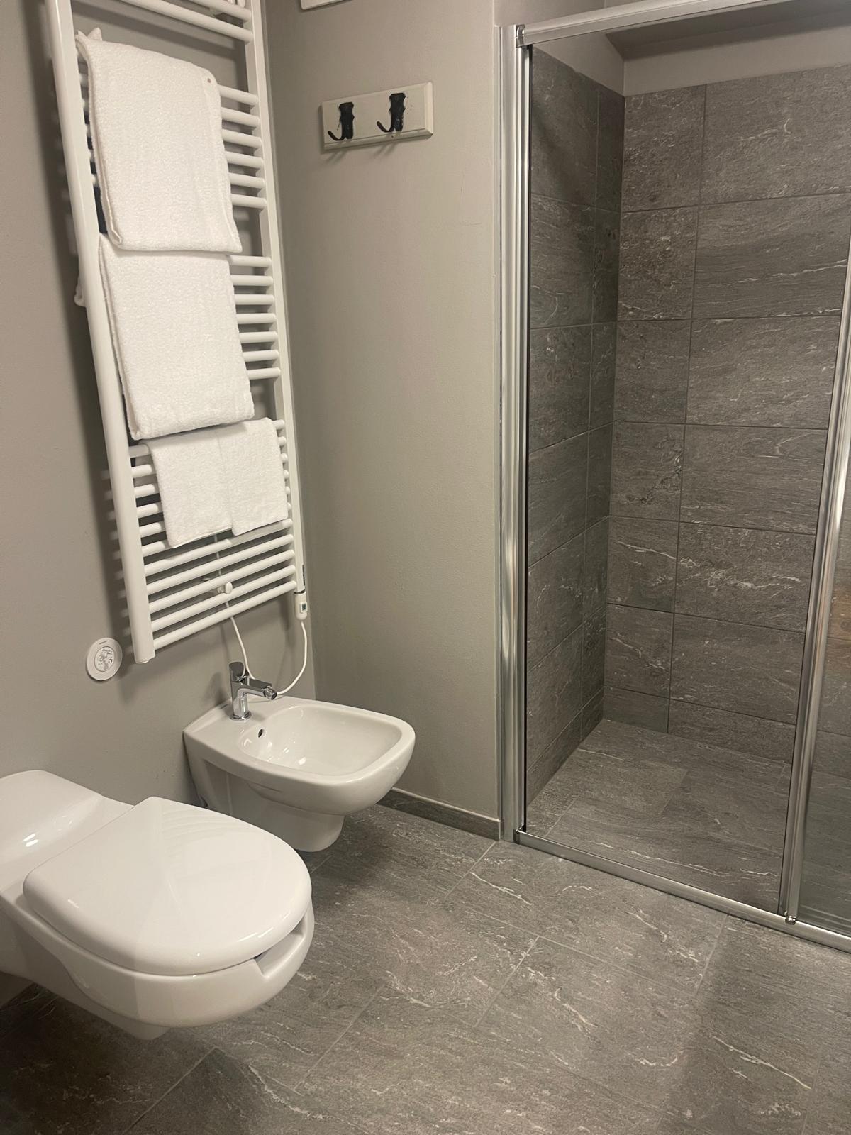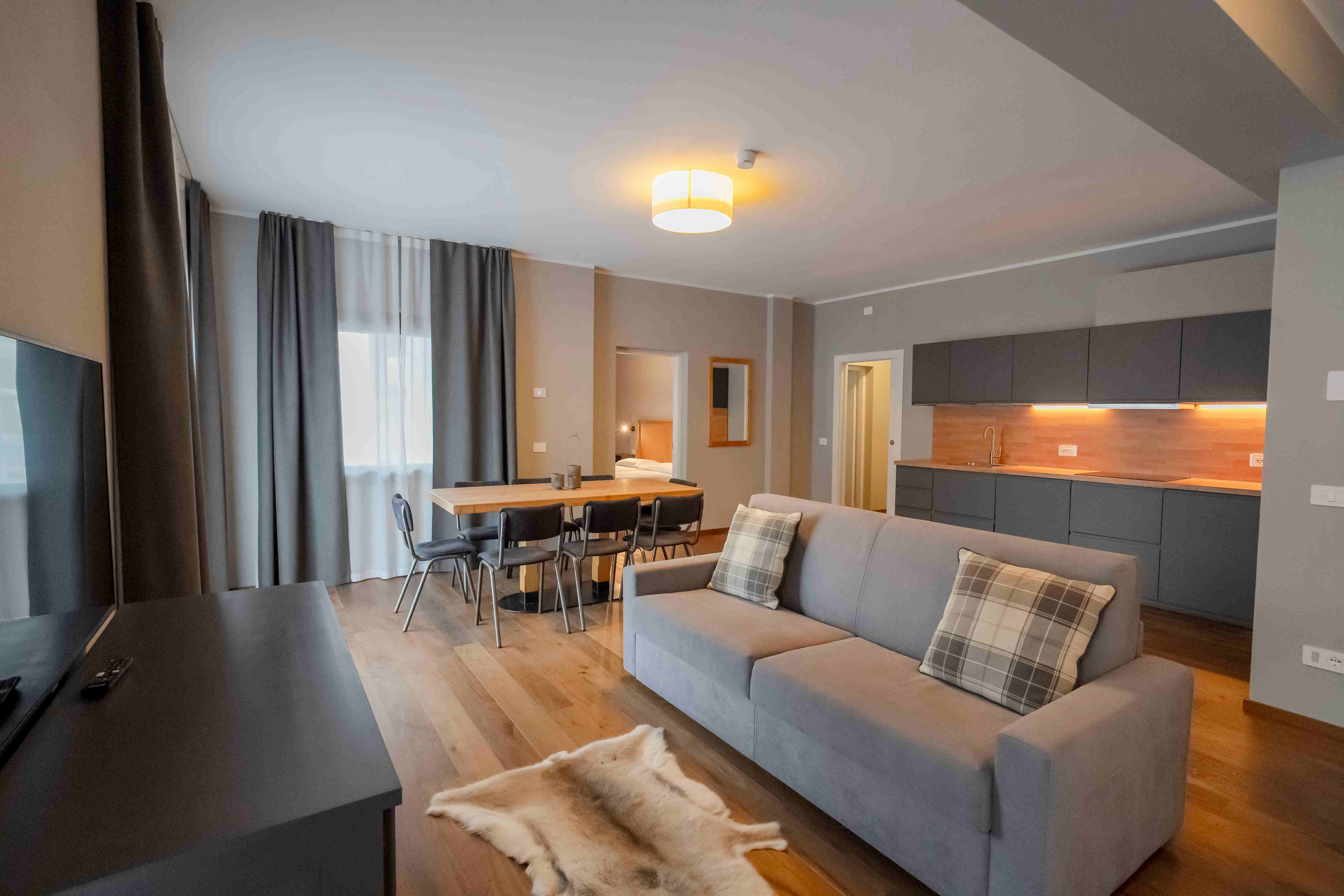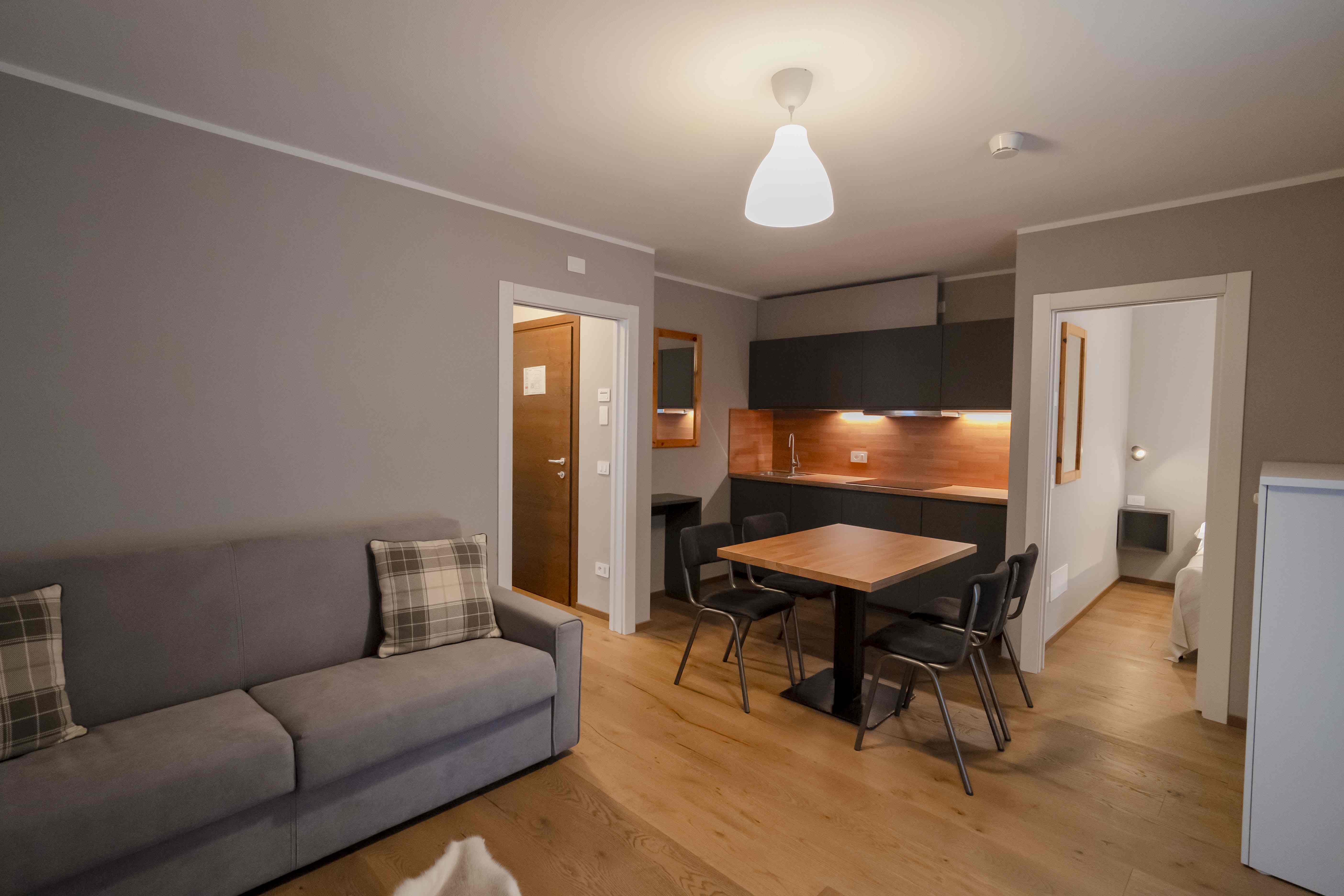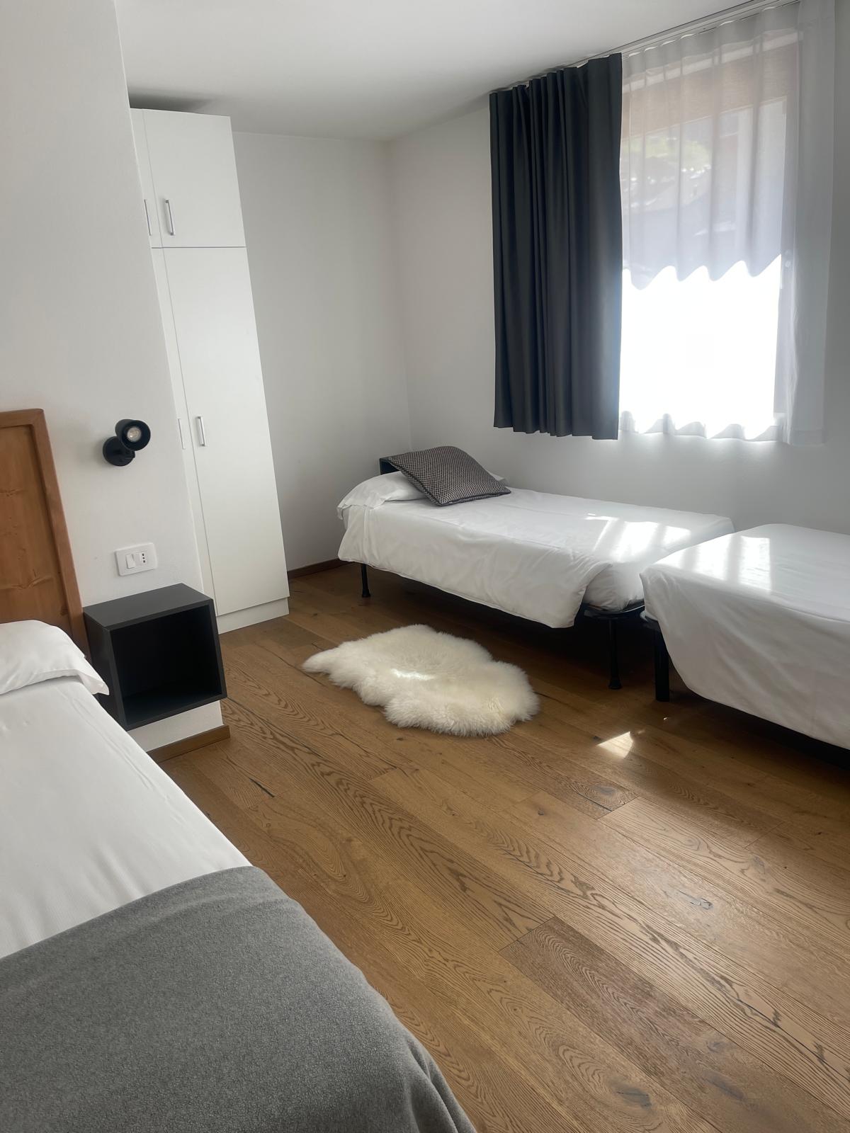 This spacious, wheelchair-accessible ground-floor two-room apartment features a double bedroom and two single beds, a hallway with a third single bed, a bathroom with a walk-in shower and bidet, and a living area with a fully equipped kitchenette, sofa, mini-fridge, and a flat-screen TV with satellite channels.