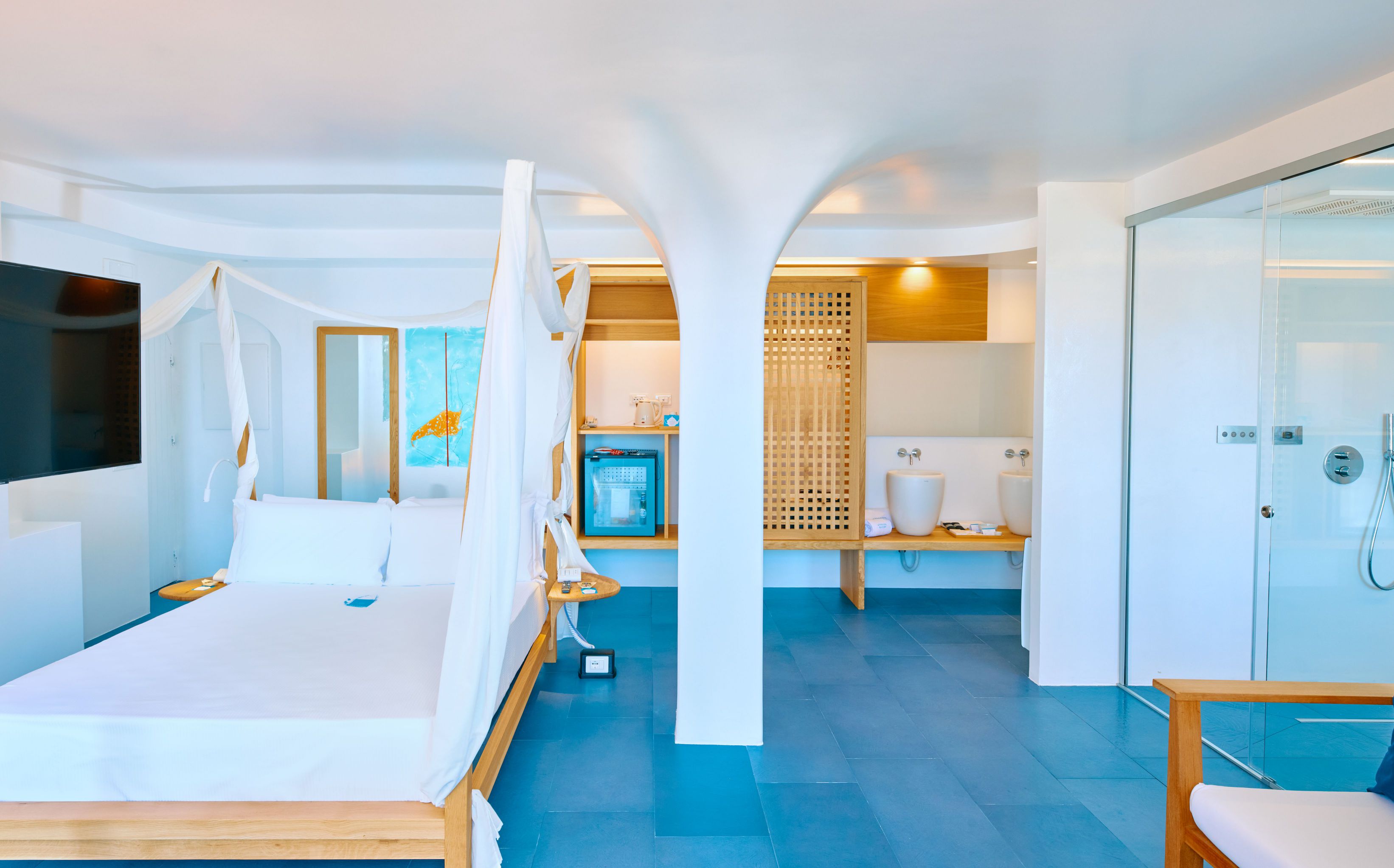 tisaneria, frigo bar, TV lcd smart con connesione internet, telefono, cassaforte, asciugacapelli,