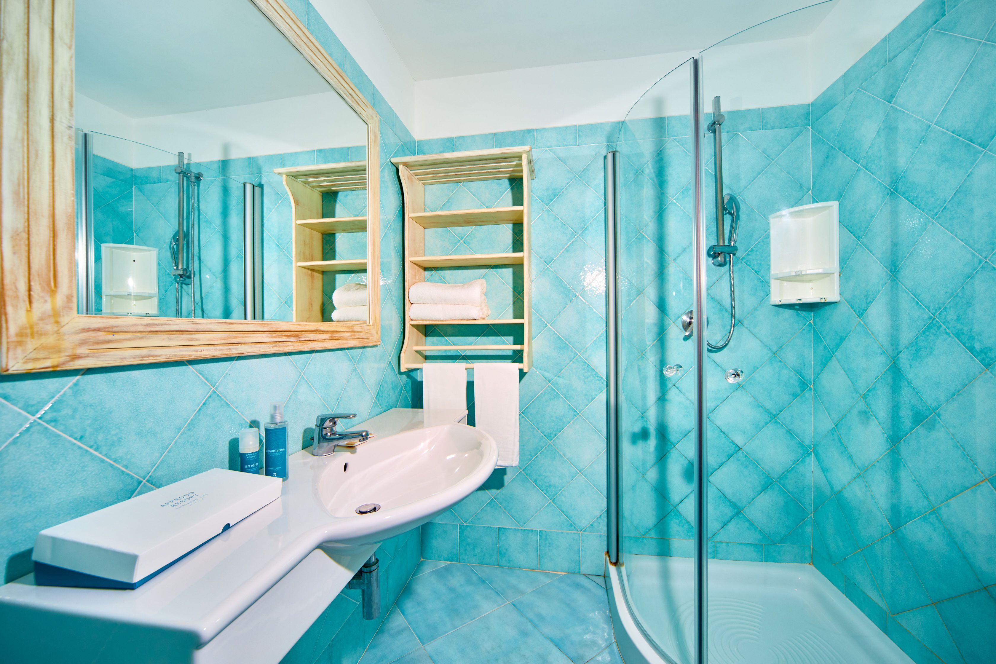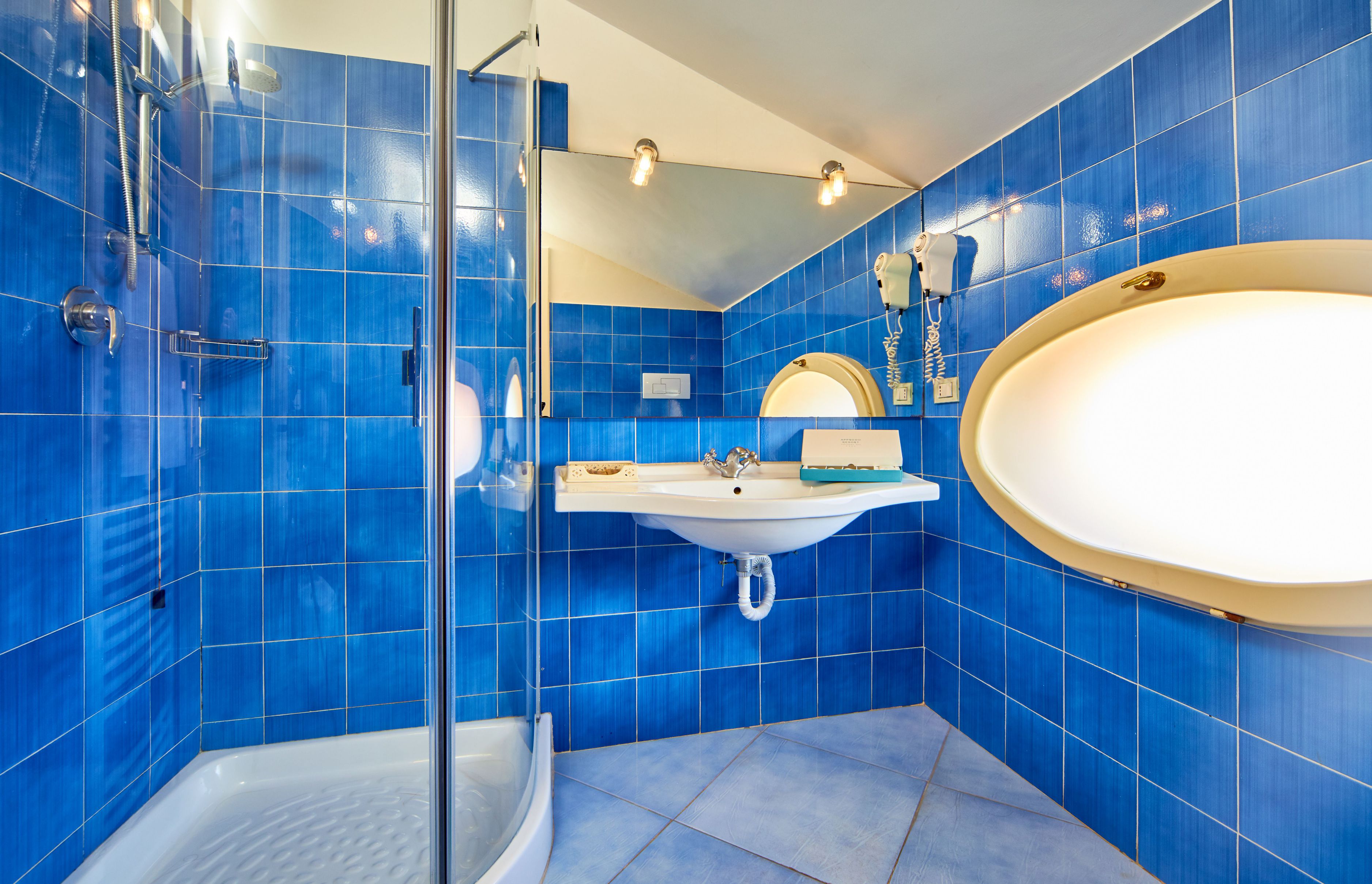 Il bagno, con doccia, è rifinito con ceramiche in stile vietrese finemente decorate.