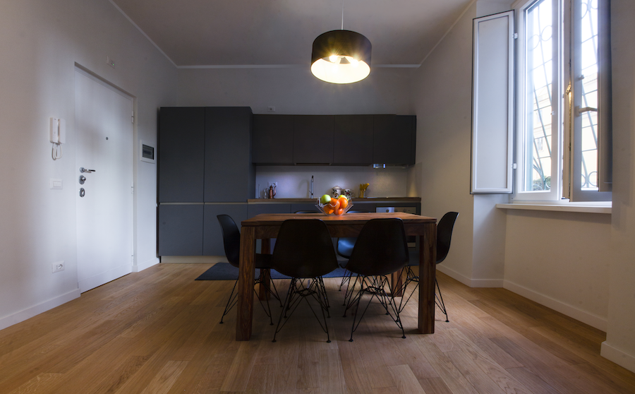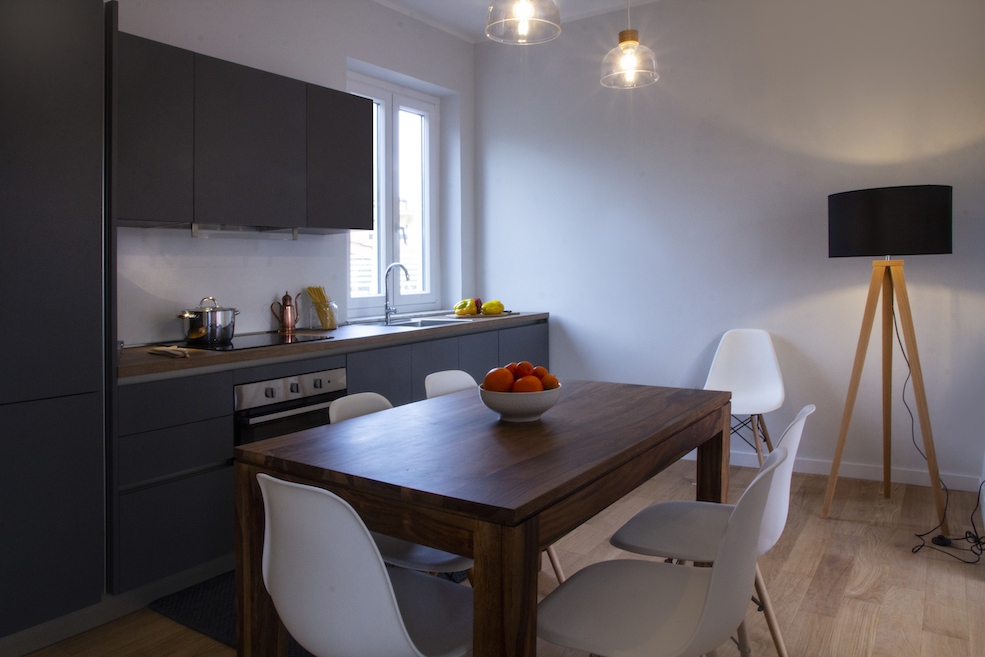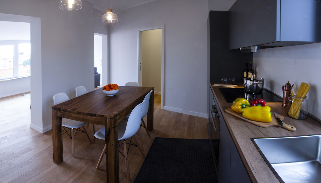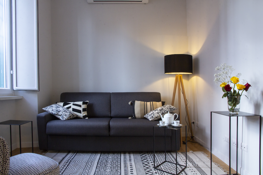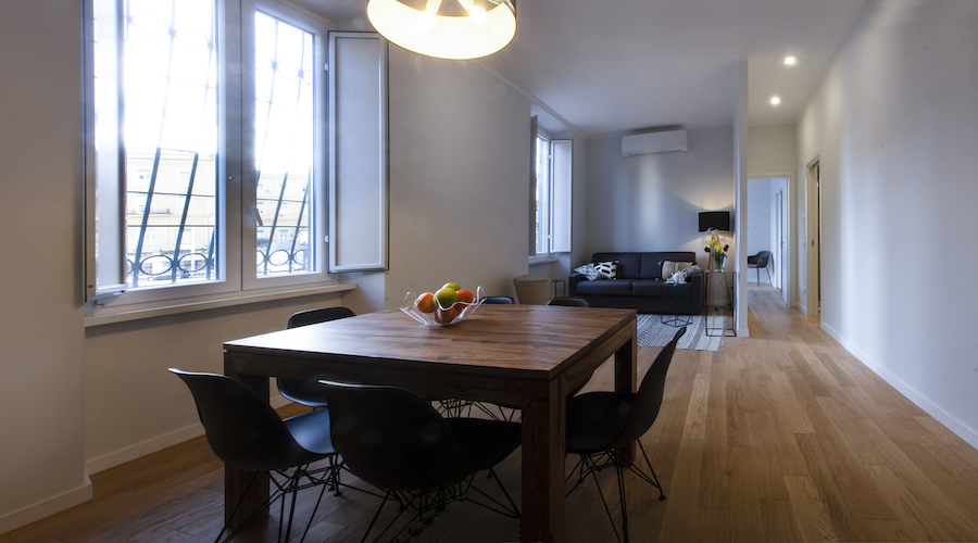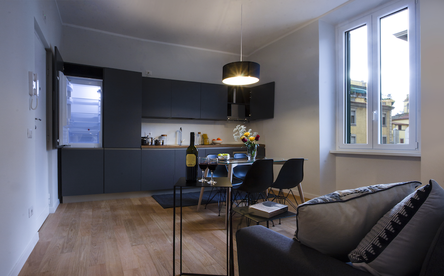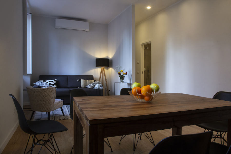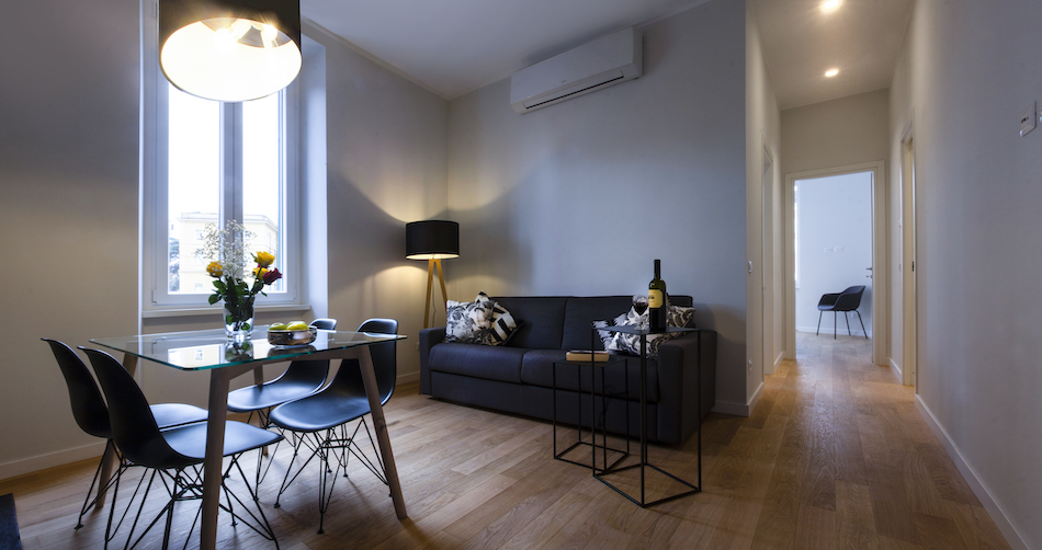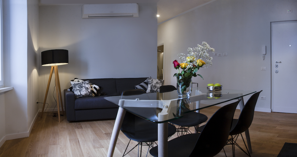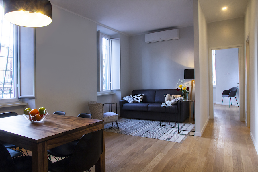 La zona notte è composta da una camera doppia e cabina armadio, una camera singola e un bagno. La zona giorno è composta da un soggiorno con divano-letto, angolo cucina attrezzato con lavastoviglie e lavatrice. Nell’appartamento è presente un balcone