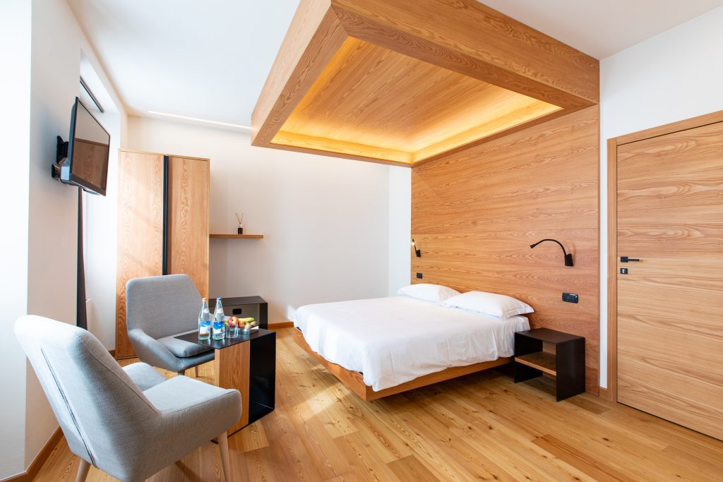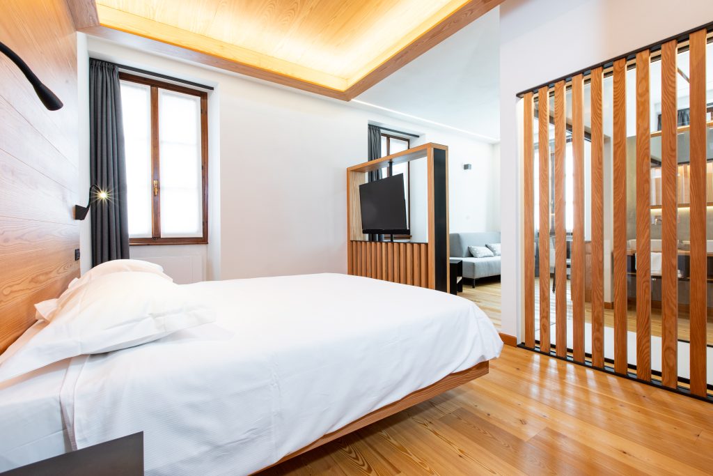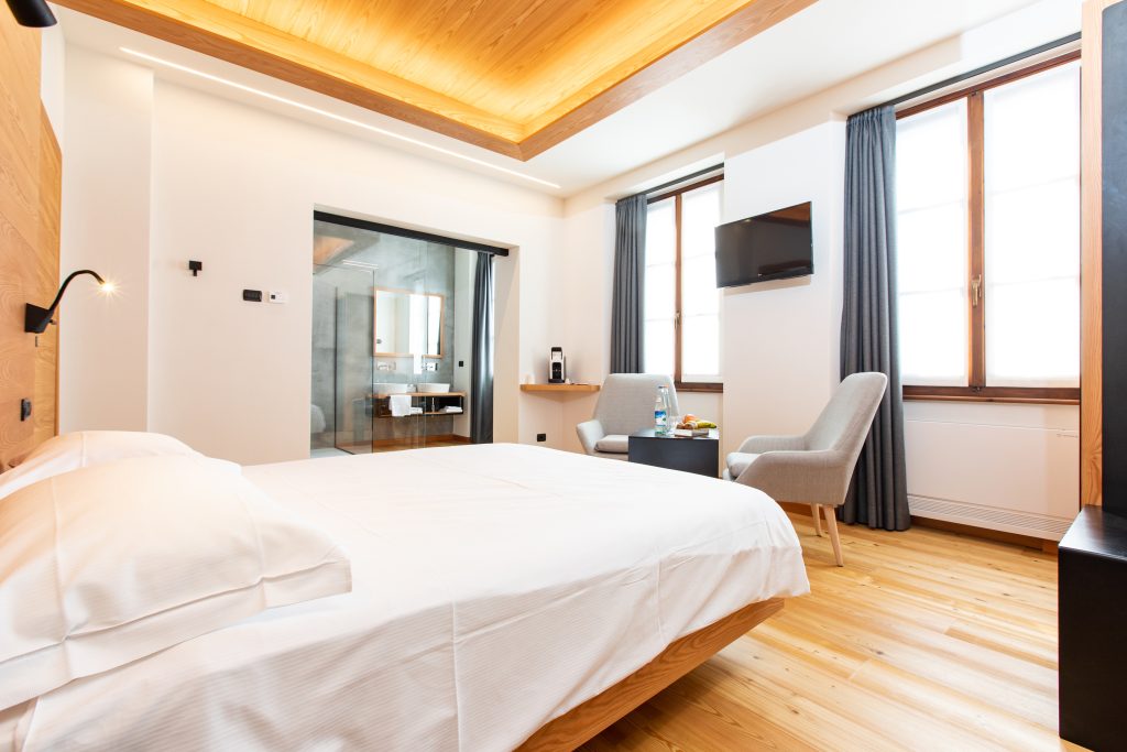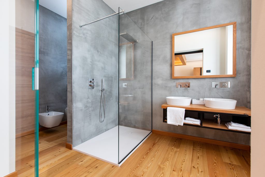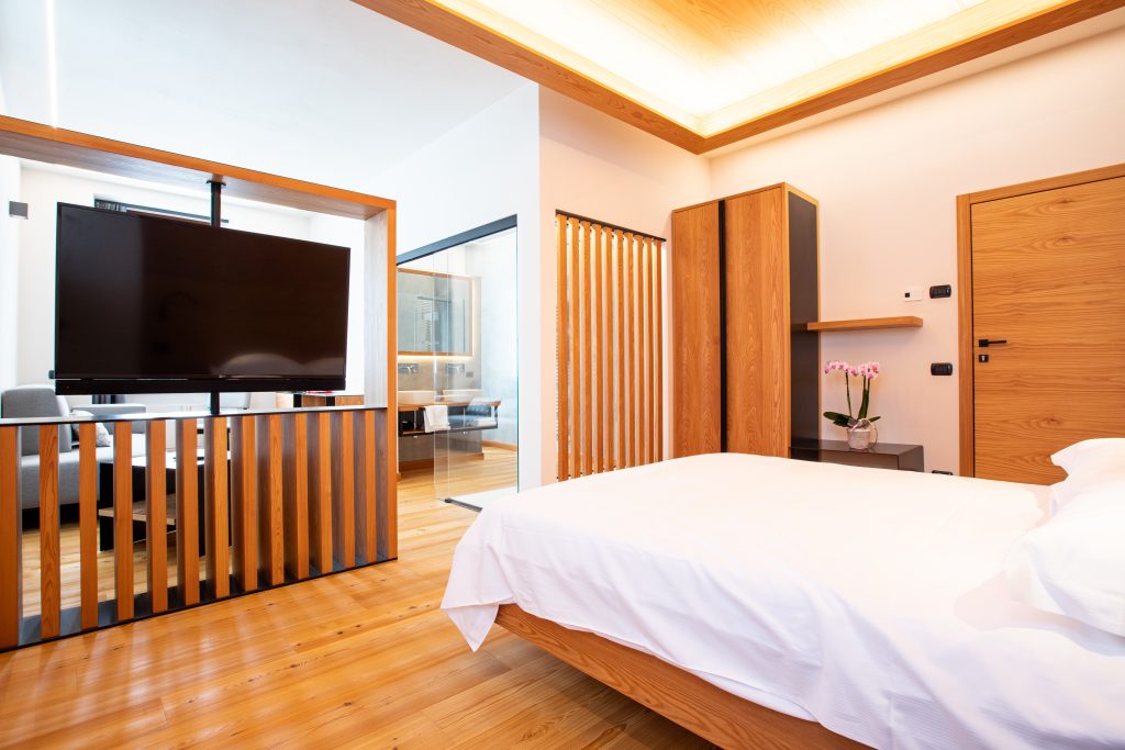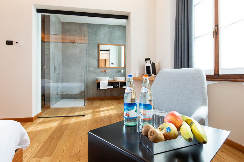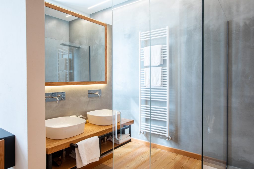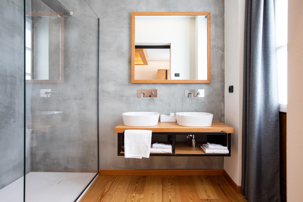 All’interno del bagno, legno e resina si estendono dalle pareti al pavimento, incorniciando una doccia in vetro, creando un ambiente caldo e confortevole. Prodotti esclusivi per il bagno e morbidi asciugamani completano l’atmosfera unica.