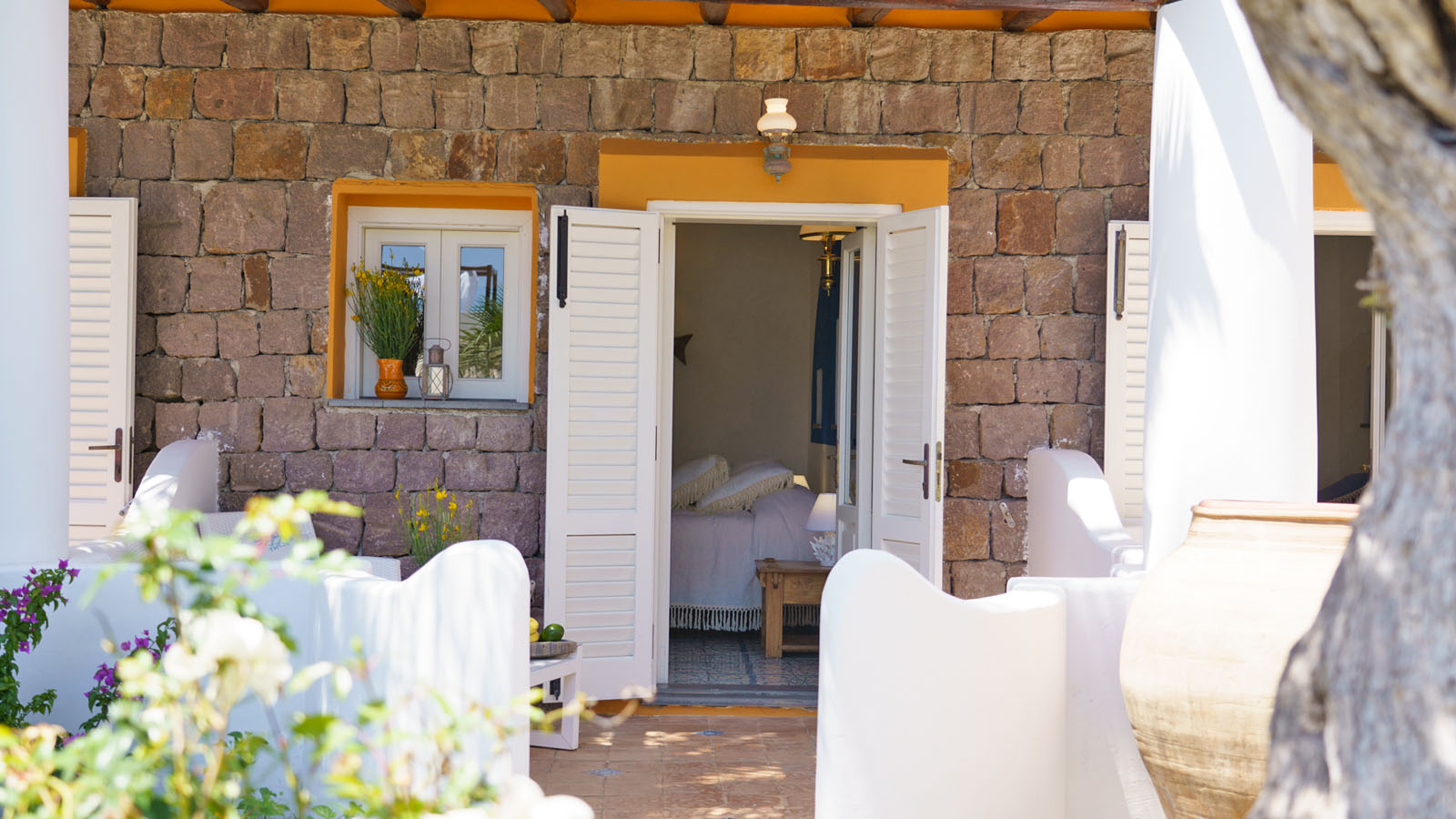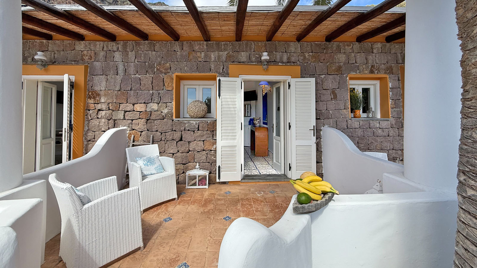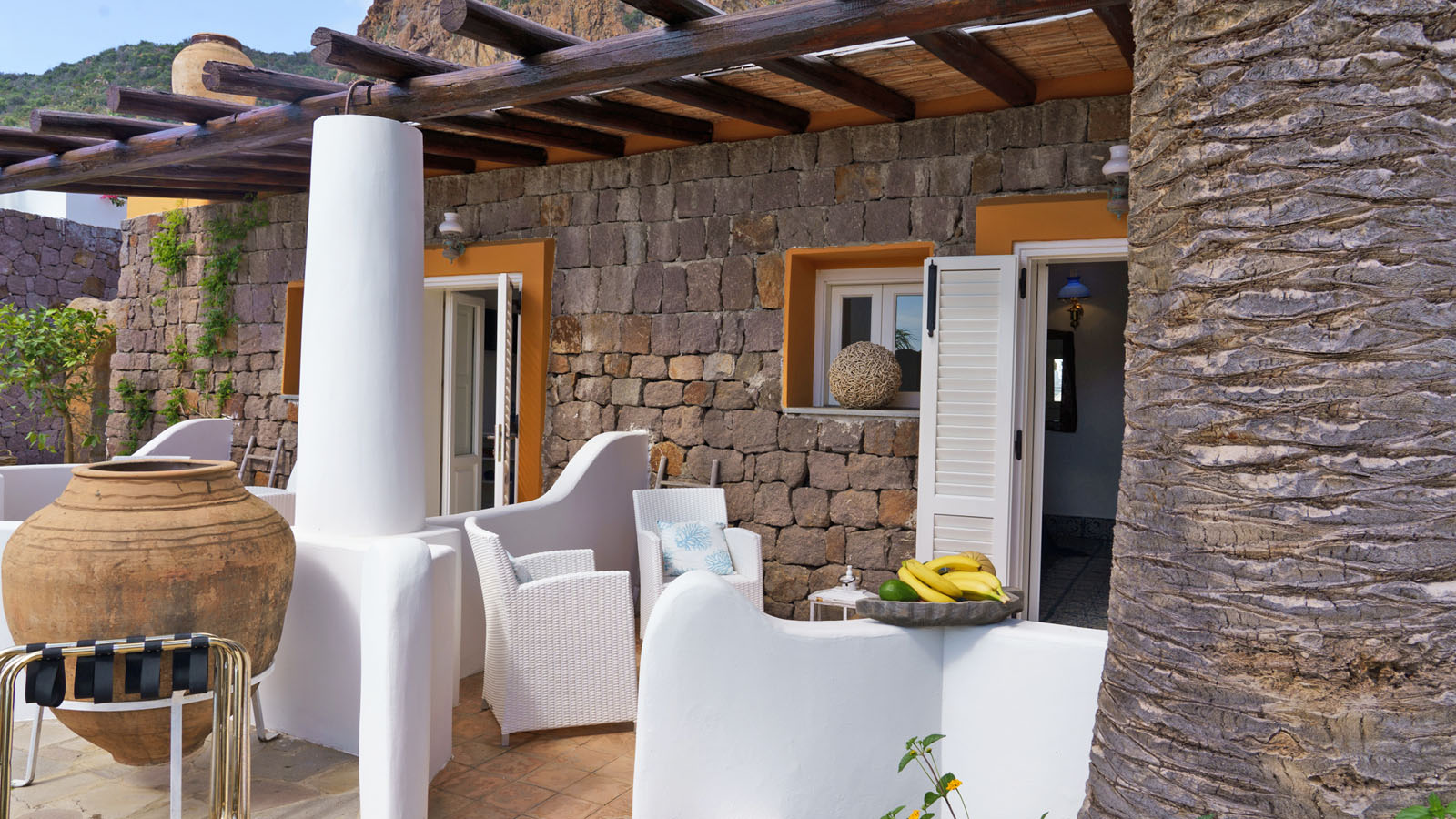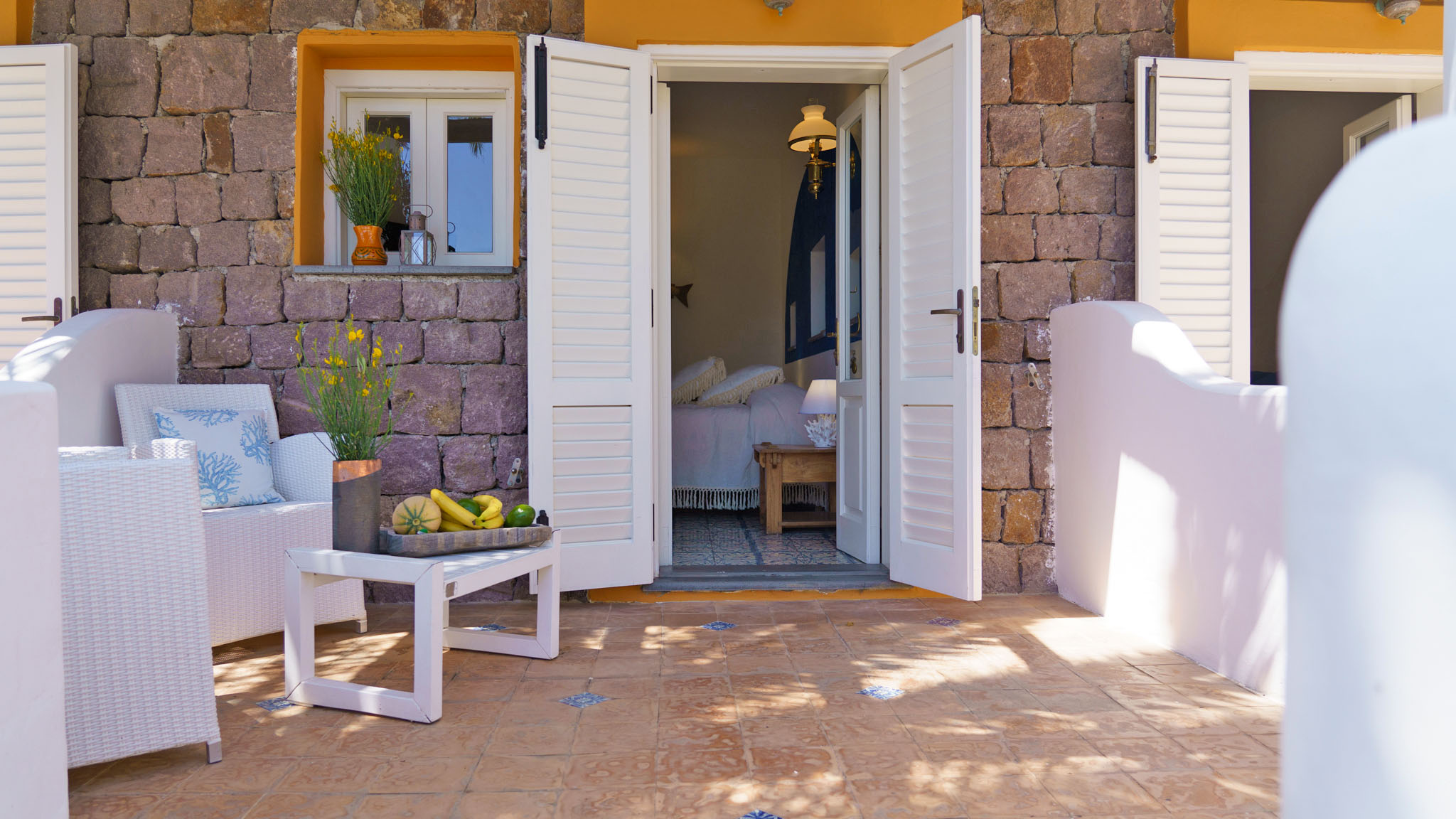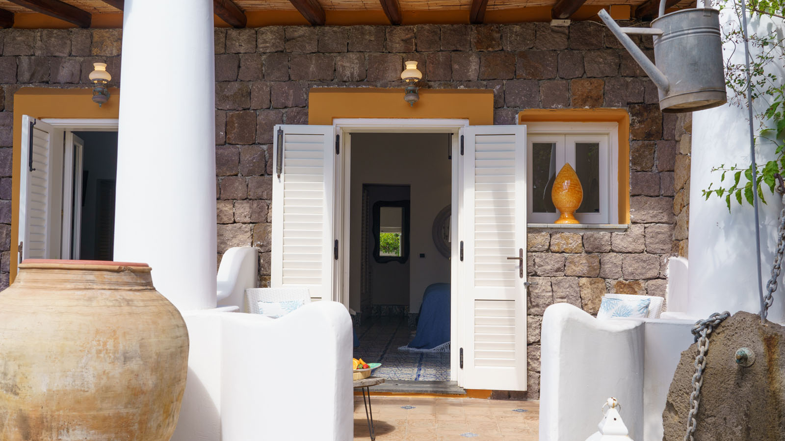 La camera dispone di camera da letto con letto matrimoniale, bagno privato in camera, ingresso indipendente, patio attrezzato, aria condizionata, frigo, TV, WiFi, giardino terrazzo comune con le alte camere della villa con un incantevole panorama sugli isolotti Dattilo, Lisca Bianca, Basiluzzo e sul vulcano Stromboli.