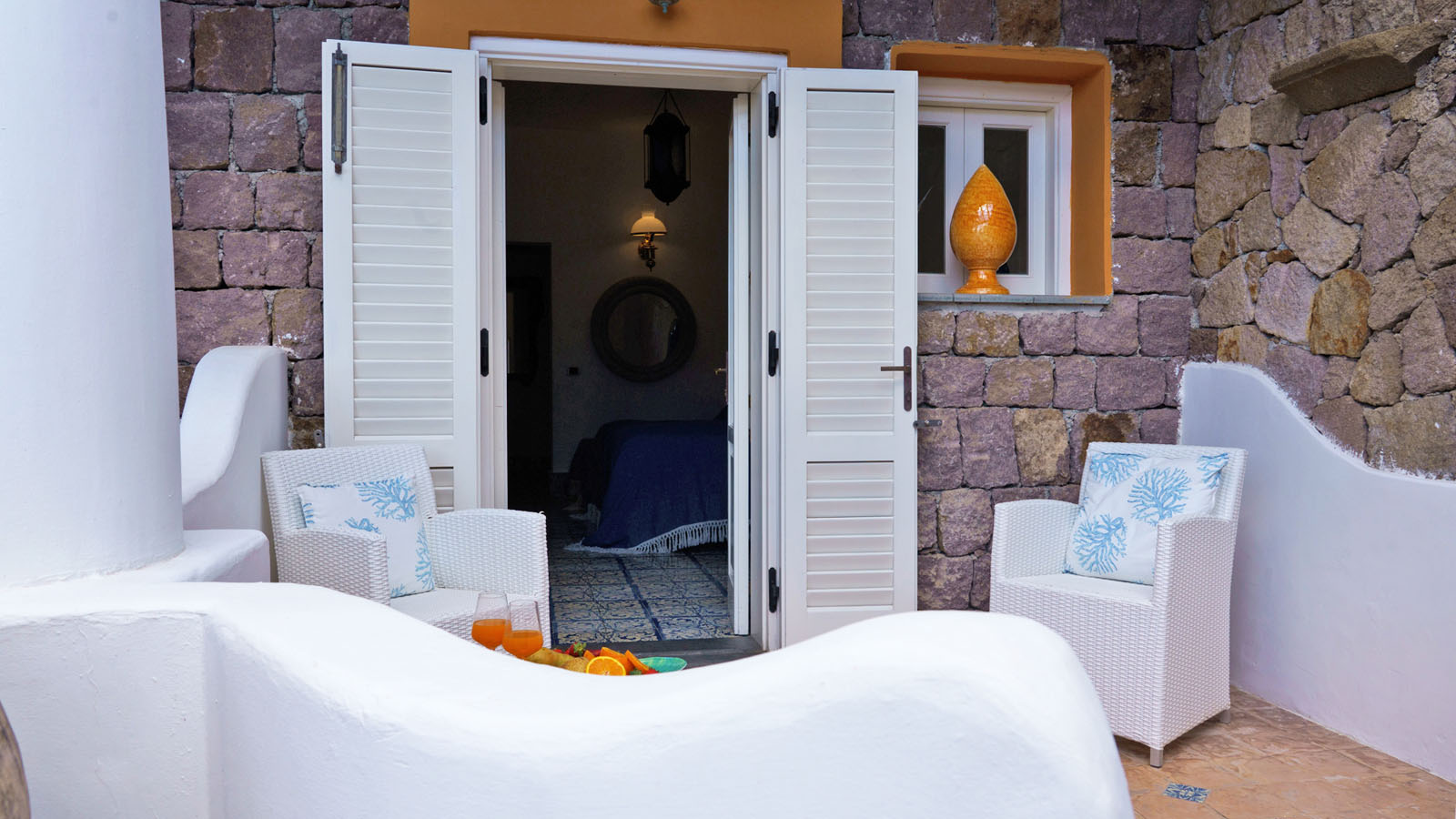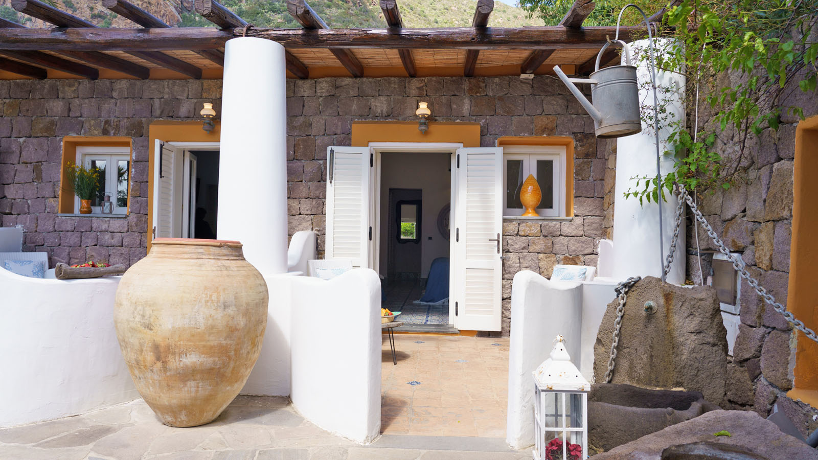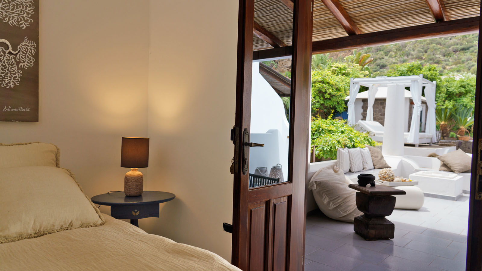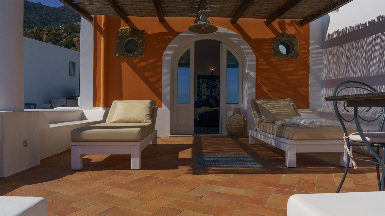 La camera dispone di camera da letto con letto matrimoniale, bagno privato in camera, ingresso indipendente, patio attrezzato, aria condizionata, frigo, TV, WiFi, giardino terrazzo comune con le alte camere della villa con un incantevole panorama sugli isolotti Dattilo, Lisca Bianca, Basiluzzo e sul vulcano Stromboli.