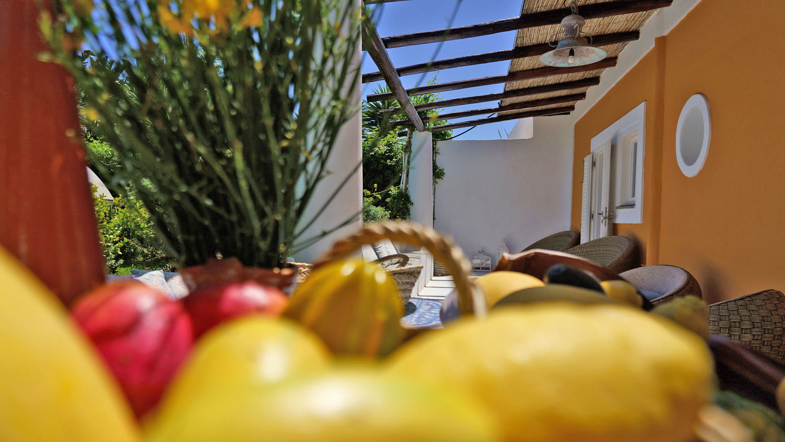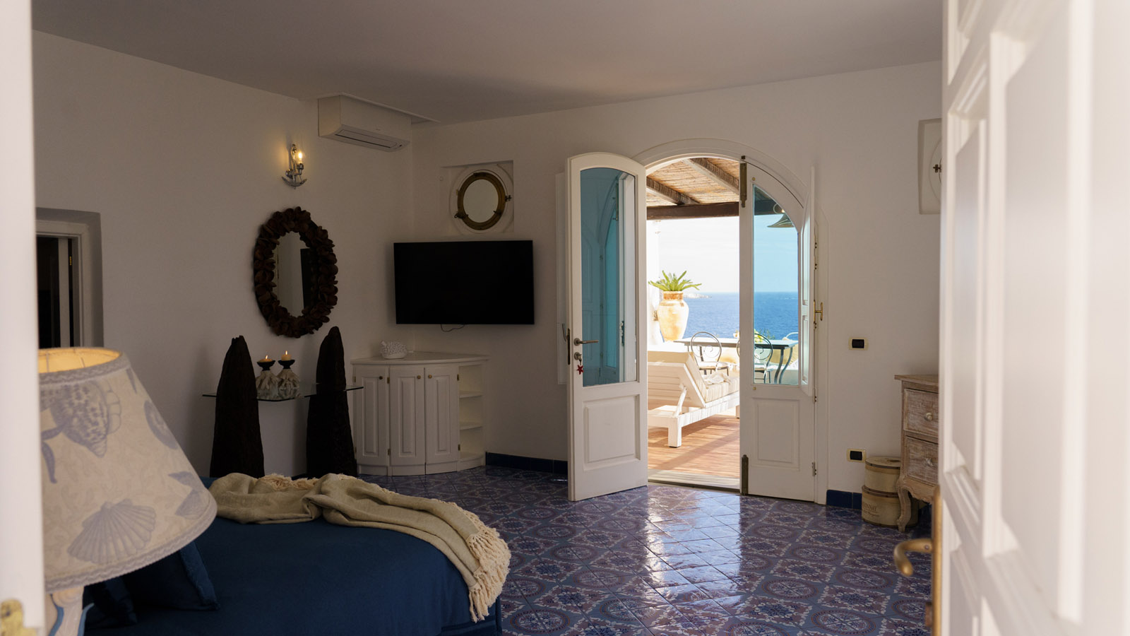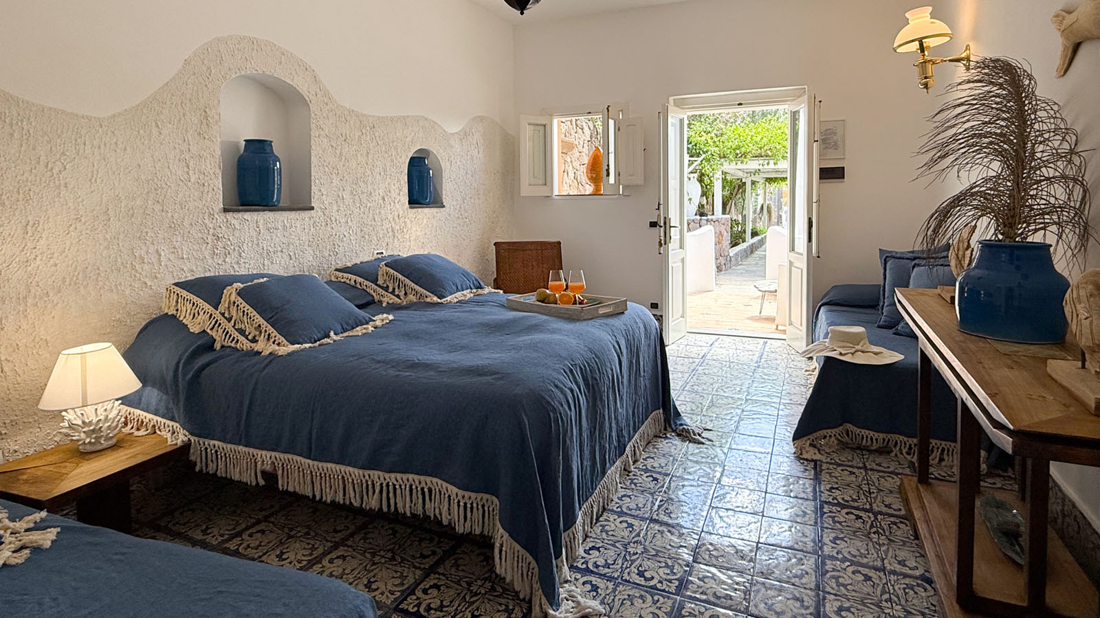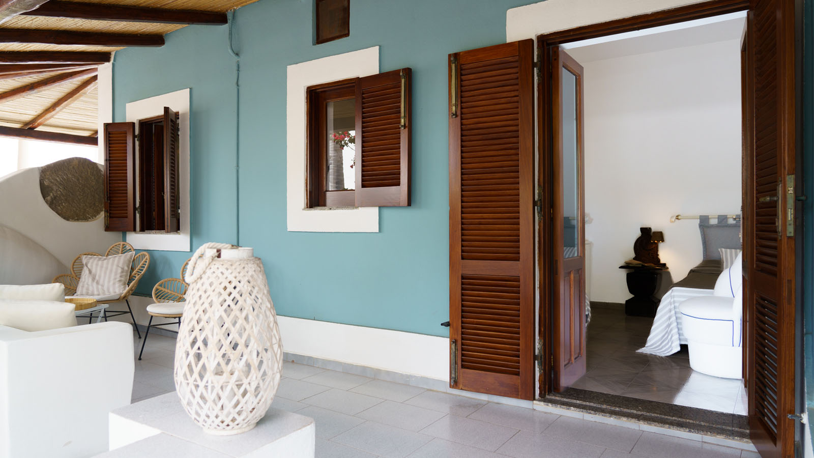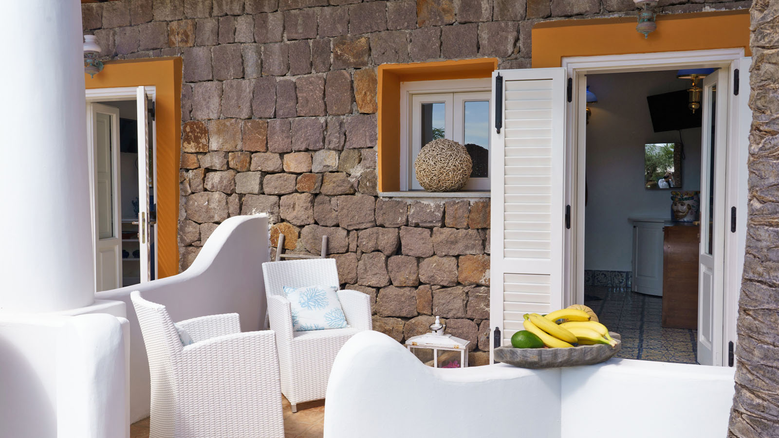 La camera dispone di camera da letto con letto matrimoniale, bagno privato in camera, ingresso indipendente, patio attrezzato, aria condizionata, frigo, TV, WiFi, giardino terrazzo comune con le alte camere della villa con un incantevole panorama sugli isolotti Dattilo, Lisca Bianca, Basiluzzo e sul vulcano Stromboli.