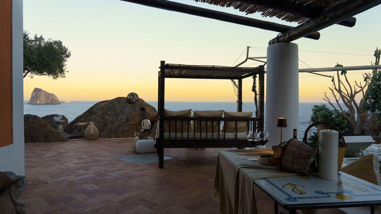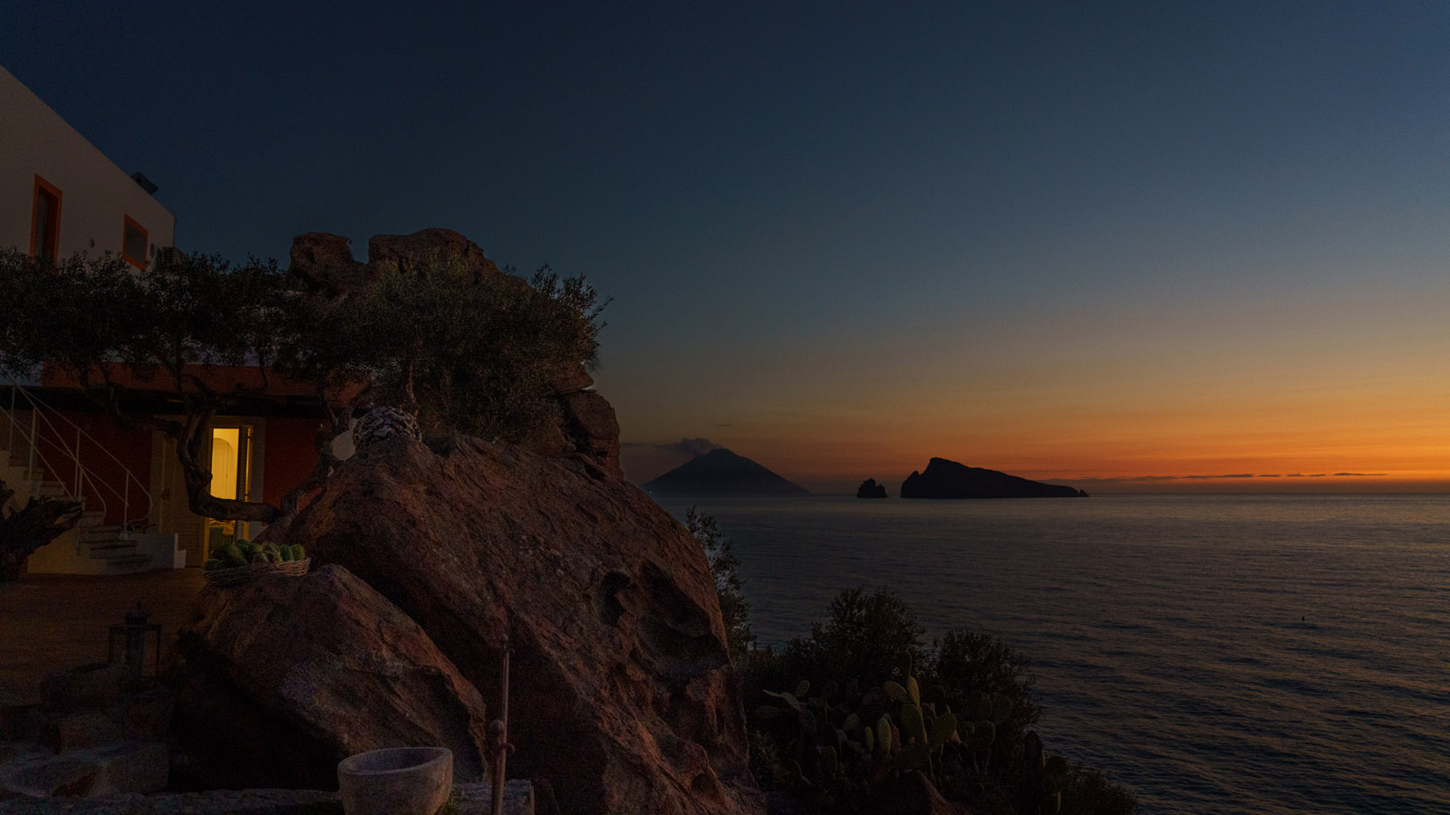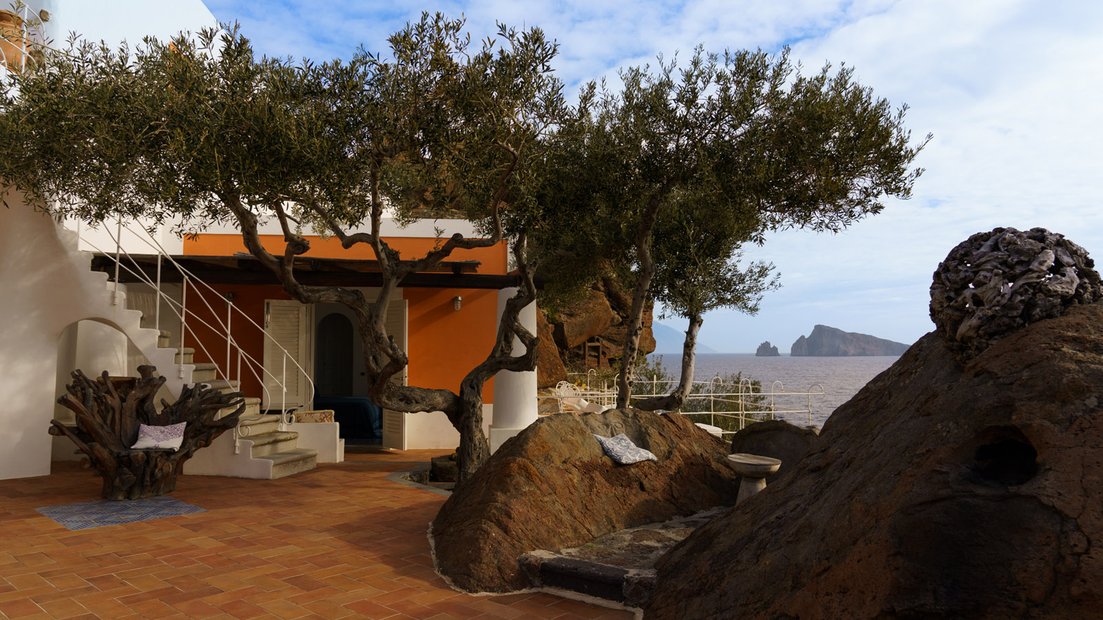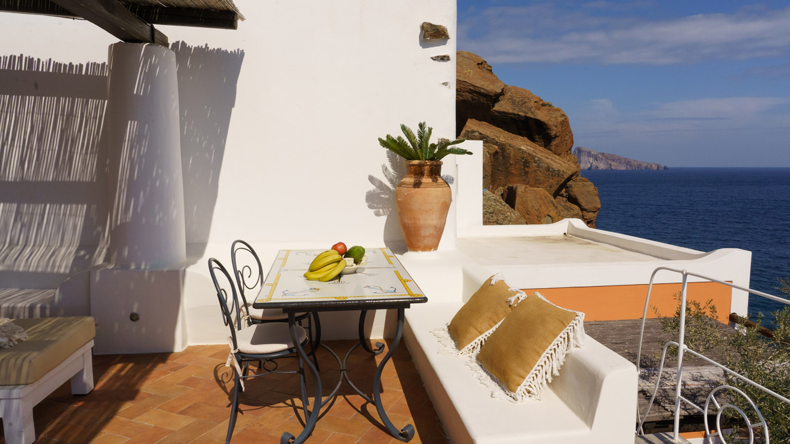 Villa Rocce Rosse è una prestigiosa residenza situata a picco sul mare, distante 10 minuti dal centro di Panarea. La villa è composta da 4 camere matrimoniali, ognuna con bagno ed ingresso indipendente, e gode di una vista mozzafiato sul mare, sugli isolotti di Dattilo, Basiluzzo e sul vulcano Stromboli.