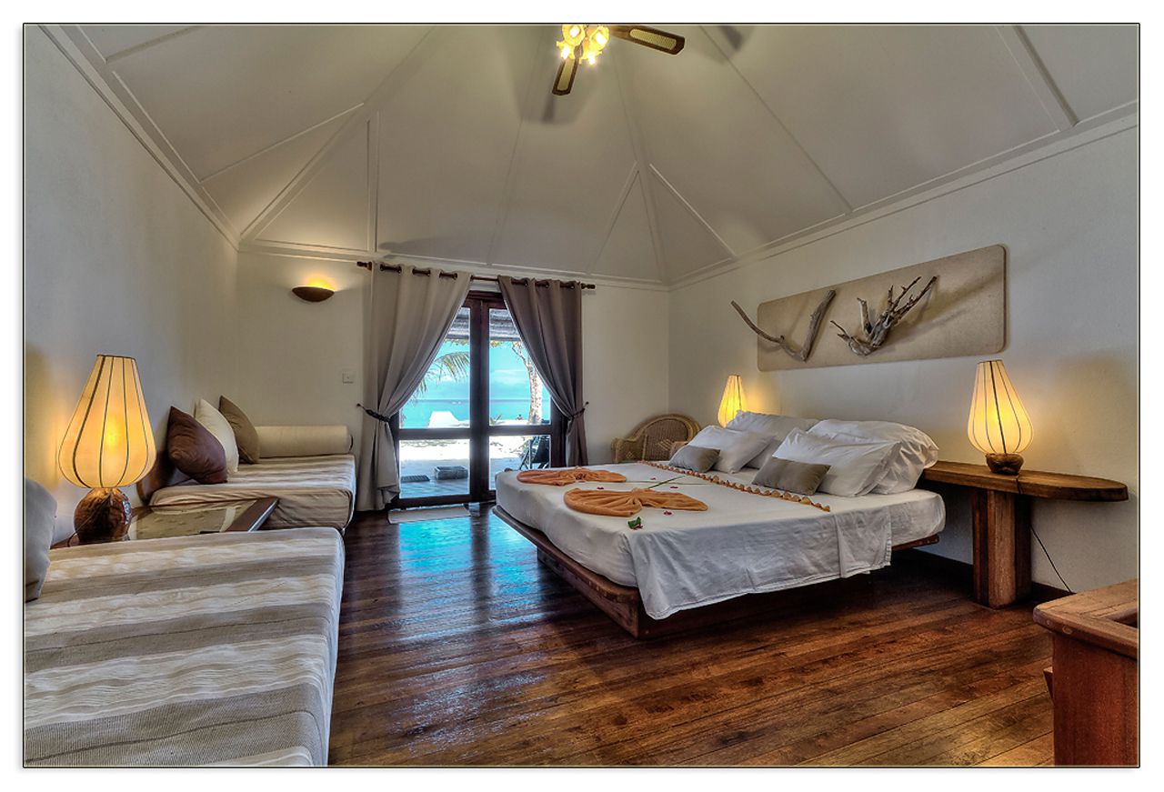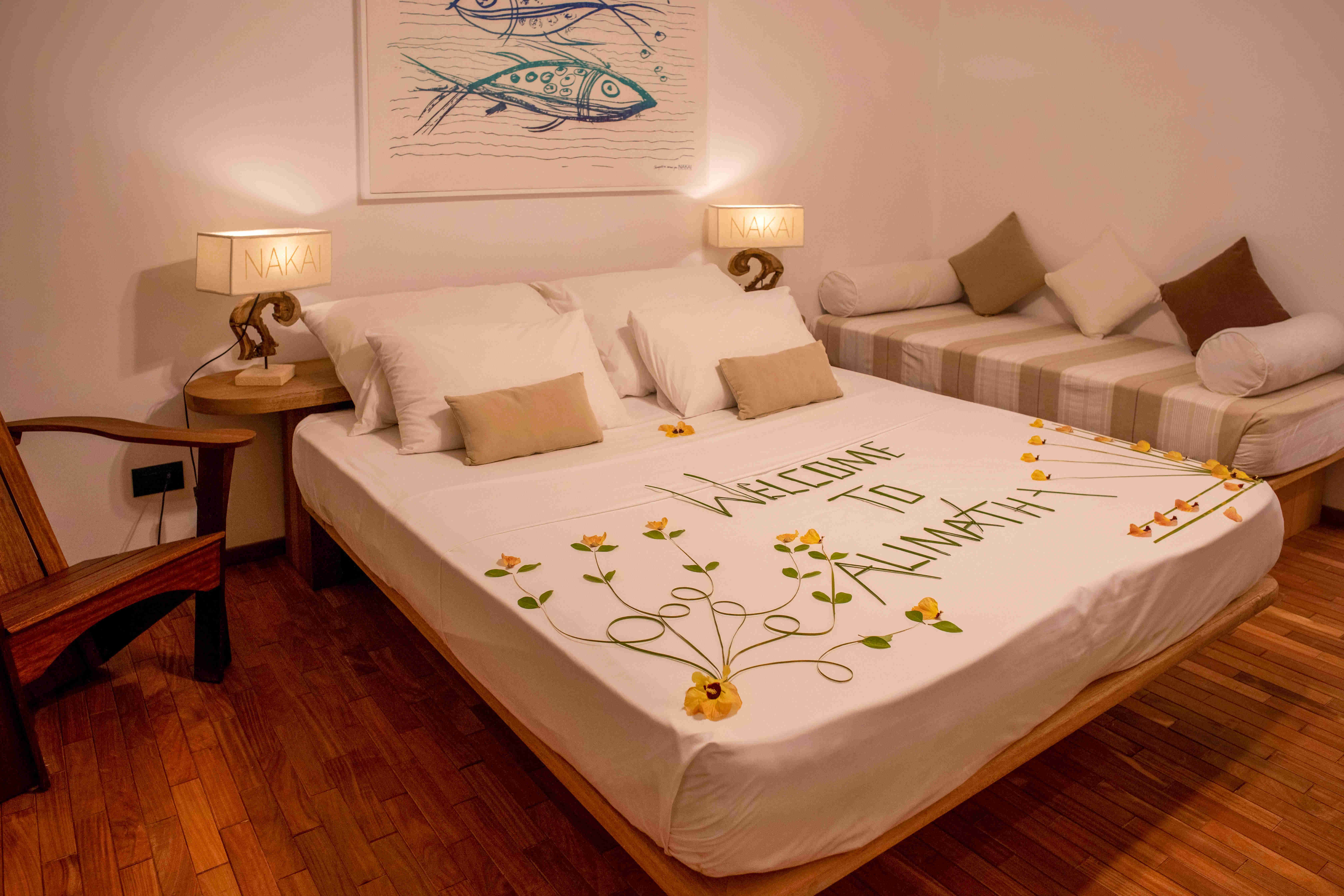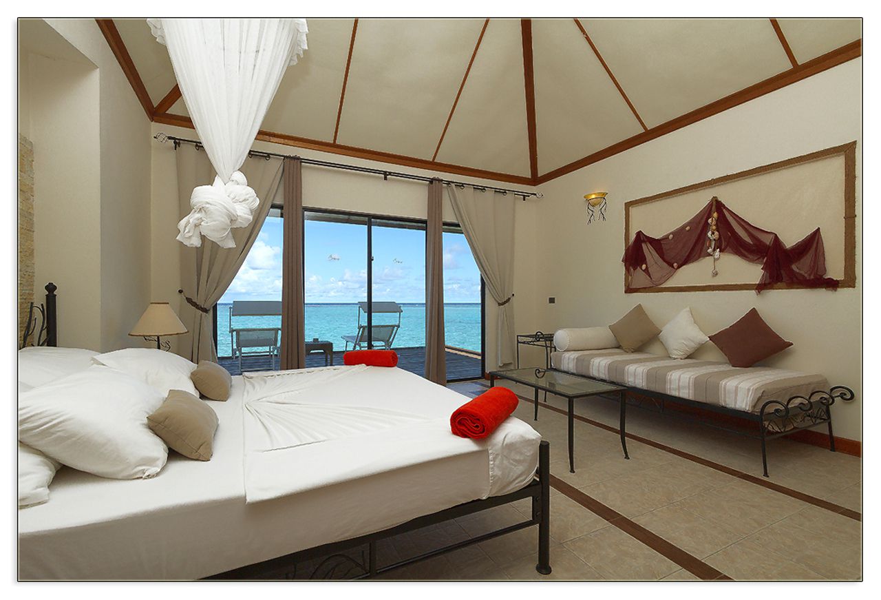bianca spiaggia corallina di Alimathà. Dal proprio deck sarà possibile ammirare l’orizzonte attraverso i
