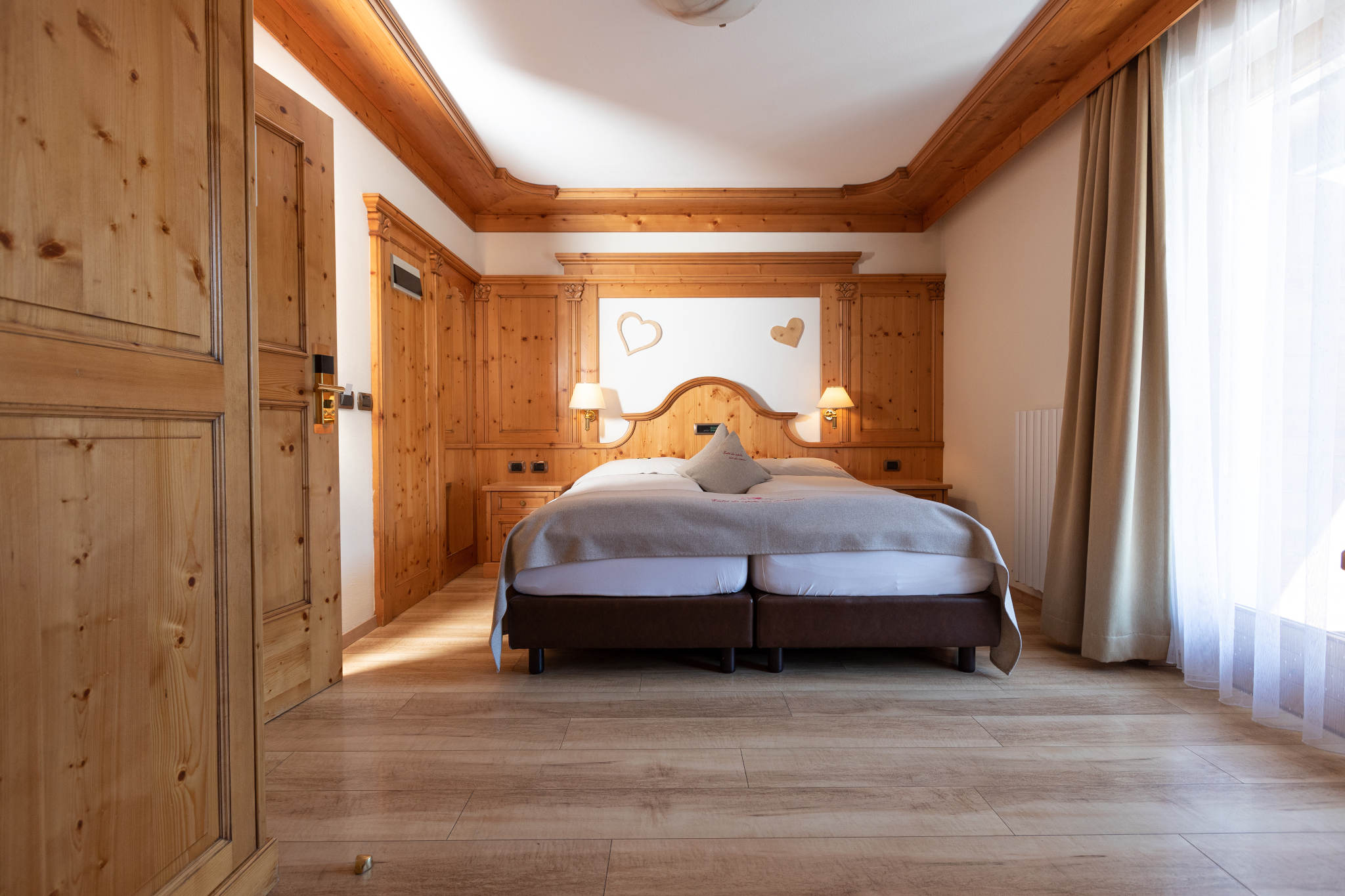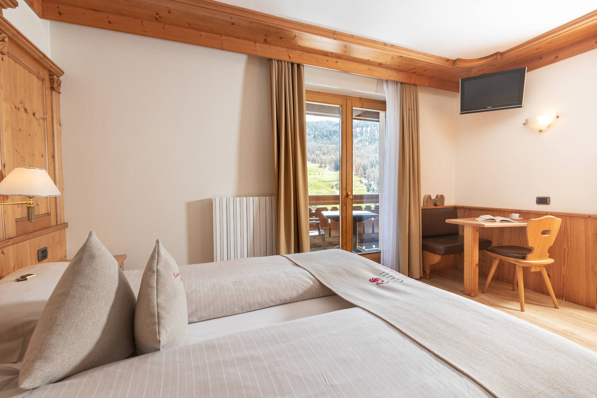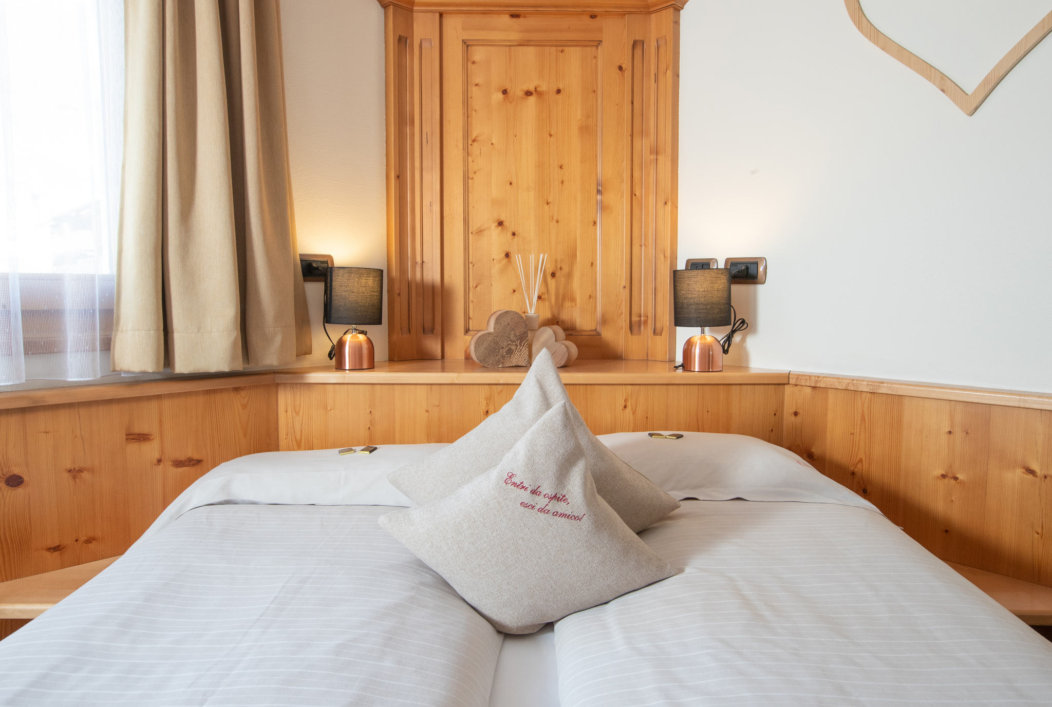 La camera doppia, con un letto matrimoniale (o due letti singoli), è la soluzione ideale per una vacanza in coppia. La stanza con vista su Livigno, è arredata in legno ed è dotata di ogni comfort: servizi privati con doccia, asciugacapelli e scaldasalviette, radio, Tv satellitare, telefono e cassaforte.