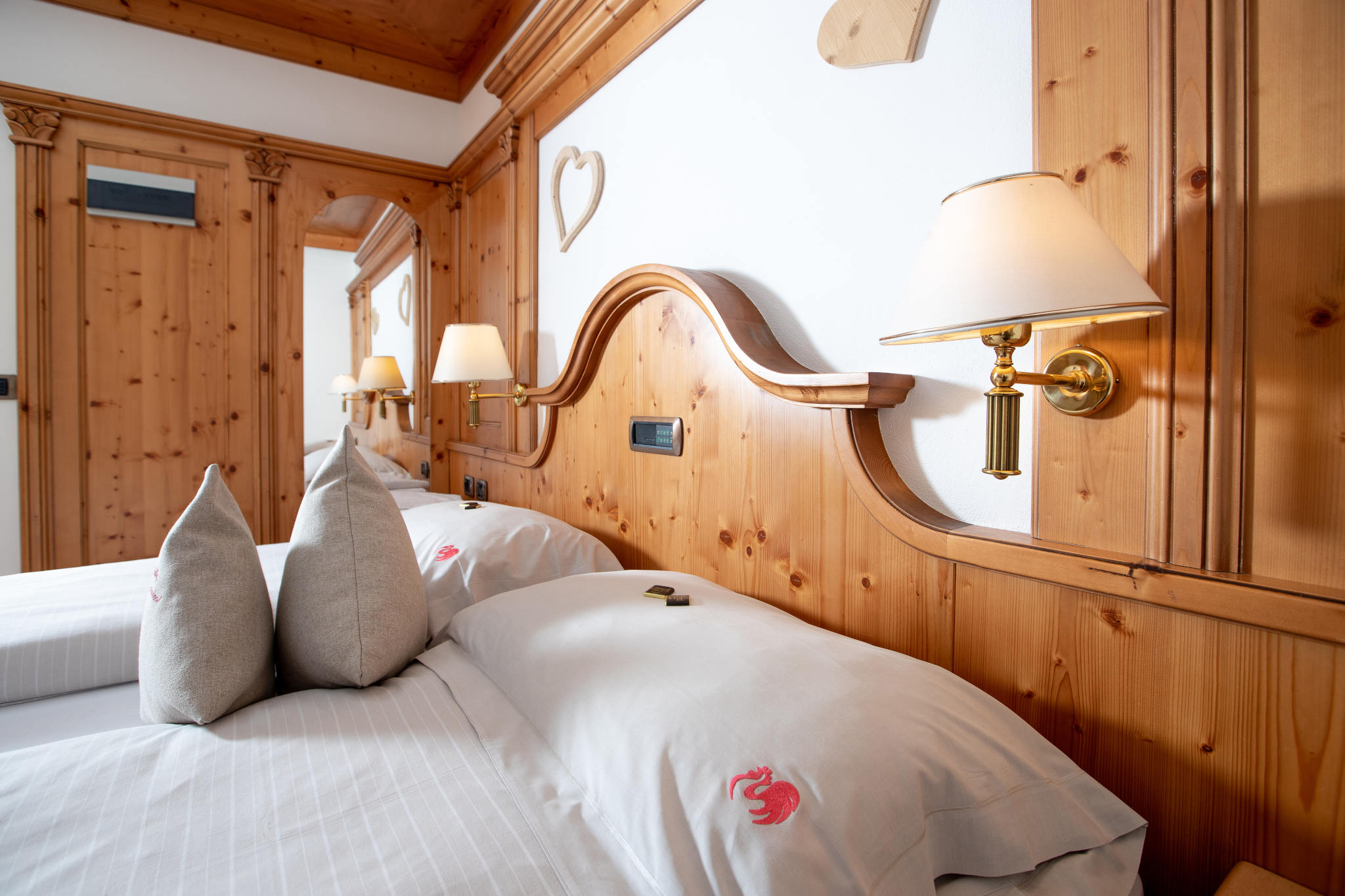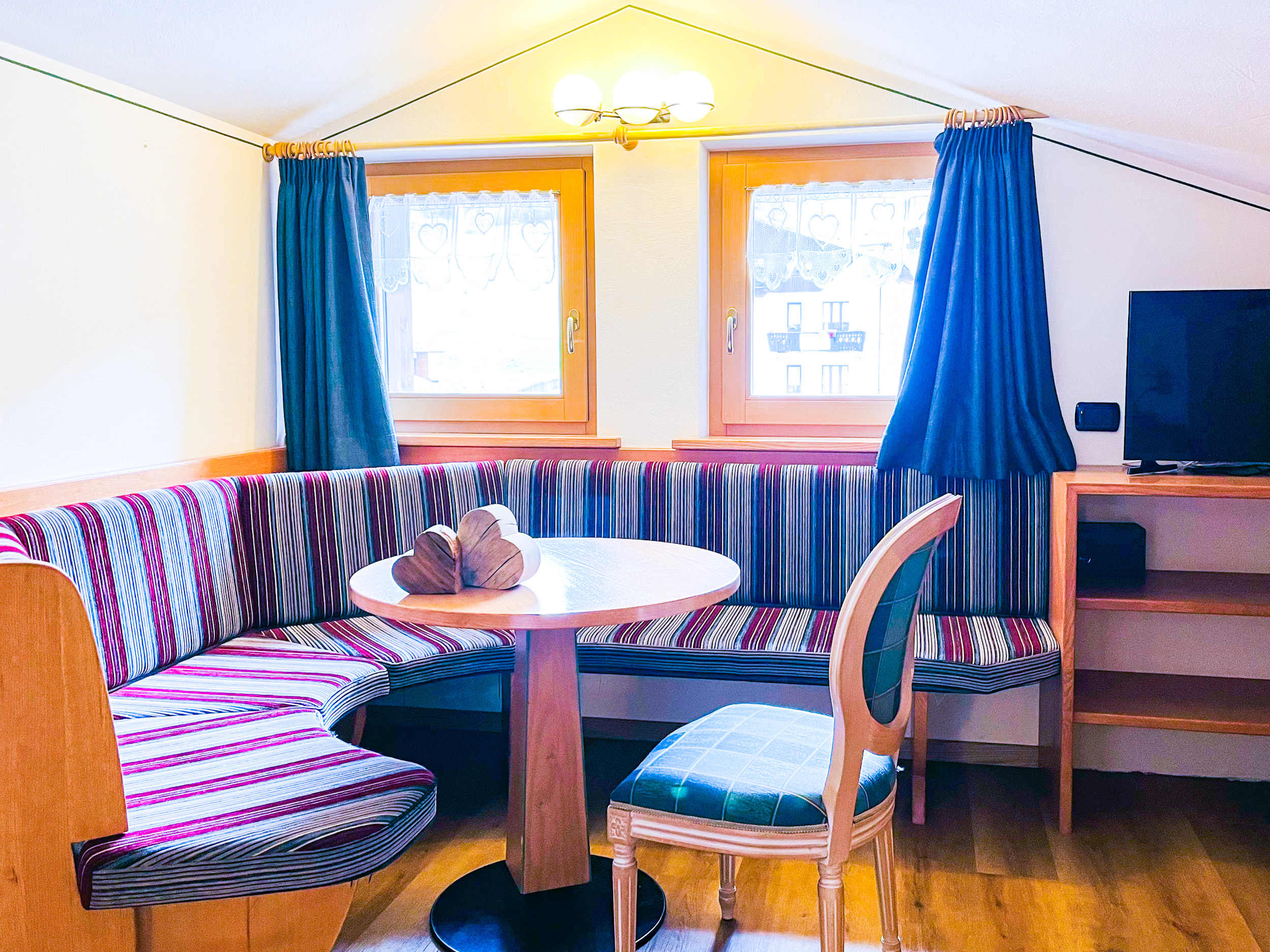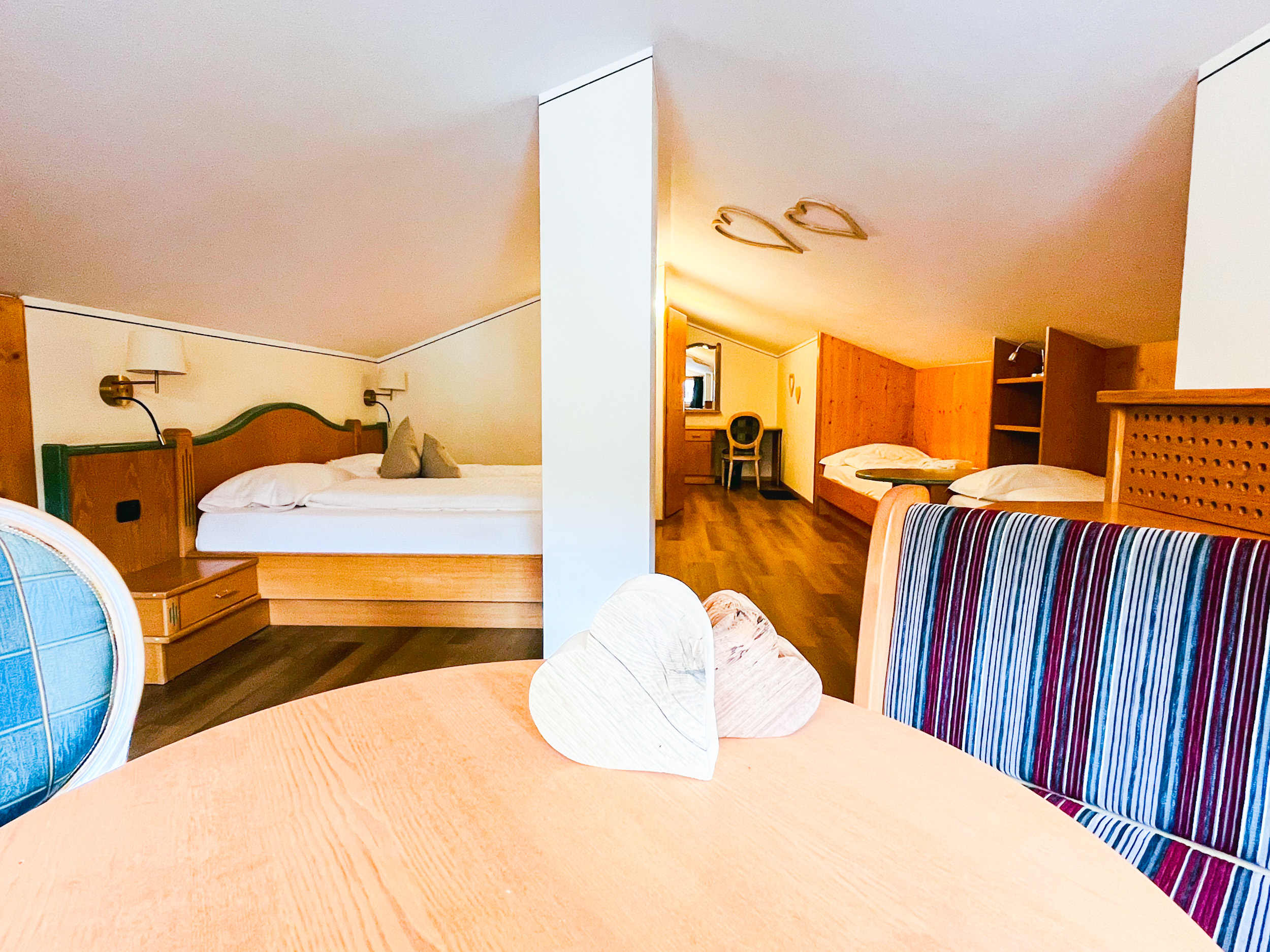 Il nostro attico, con un letto matrimoniale e due singoli, è la soluzione ideale per un gruppo o una famiglia di quattro persone. Il nostro attico è raggiungibile con l’ascensore fino al terzo piano dell’Hotel e per accedervi è necessario utilizzare una scala a chiocciola. Il soffitto, più basso rispetto alle altre stanze rende il soggiorno ancora più intimo e accogliente e rispetta a pieno lo stile tipico della montagna. Essendo la mansarda più bassa in alcuni punti non la consigliamo a chi è più alto di 1.80m La nostra camera attico è dotato di tutti i comfort, tra cui: servizi privati con doccia, asciugacapelli e scalda salviette, asciugamani e morbidi accappatoi, radio, Tv satellitare e cassaforte inoltre il tavolino rotondo con cassapanca presente in stanza è il luogo ideale per una partita a carte, una merenda o un aperitivo in famiglia o tra amici.