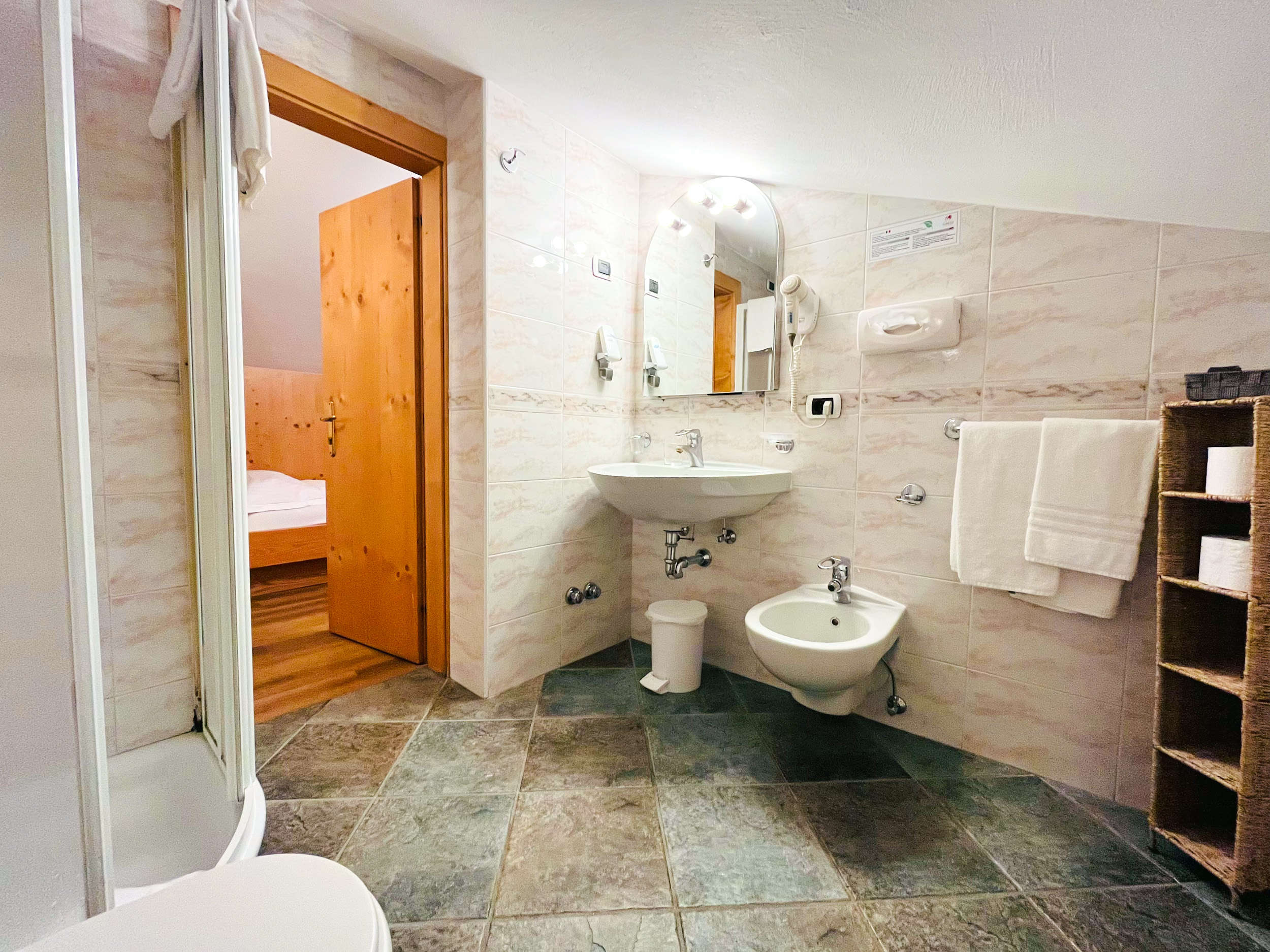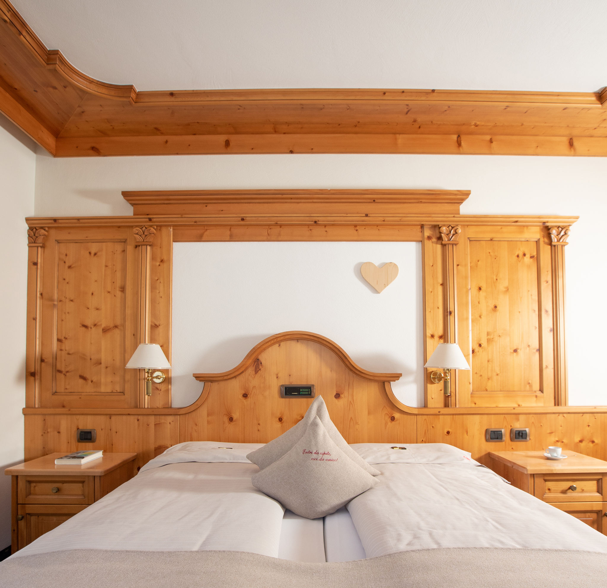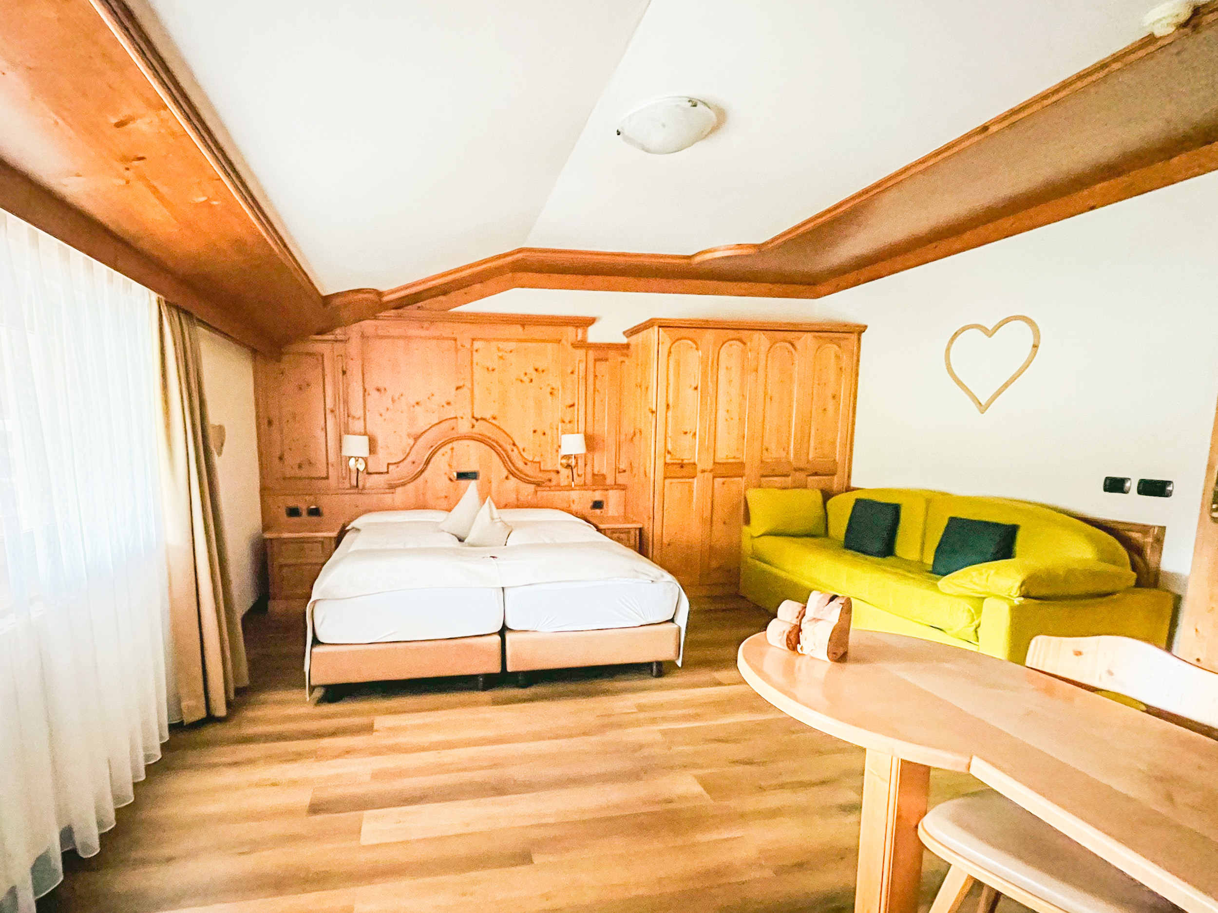 Il nostro attico, con un letto matrimoniale e due singoli, è la soluzione ideale per un gruppo o una famiglia di quattro persone. Il nostro attico è raggiungibile con l’ascensore fino al terzo piano dell’Hotel e per accedervi è necessario utilizzare una scala a chiocciola. Il soffitto, più basso rispetto alle altre stanze rende il soggiorno ancora più intimo e accogliente e rispetta a pieno lo stile tipico della montagna. Essendo la mansarda più bassa in alcuni punti non la consigliamo a chi è più alto di 1.80m La nostra camera attico è dotato di tutti i comfort, tra cui: servizi privati con doccia, asciugacapelli e scalda salviette, asciugamani e morbidi accappatoi, radio, Tv satellitare e cassaforte inoltre il tavolino rotondo con cassapanca presente in stanza è il luogo ideale per una partita a carte, una merenda o un aperitivo in famiglia o tra amici.