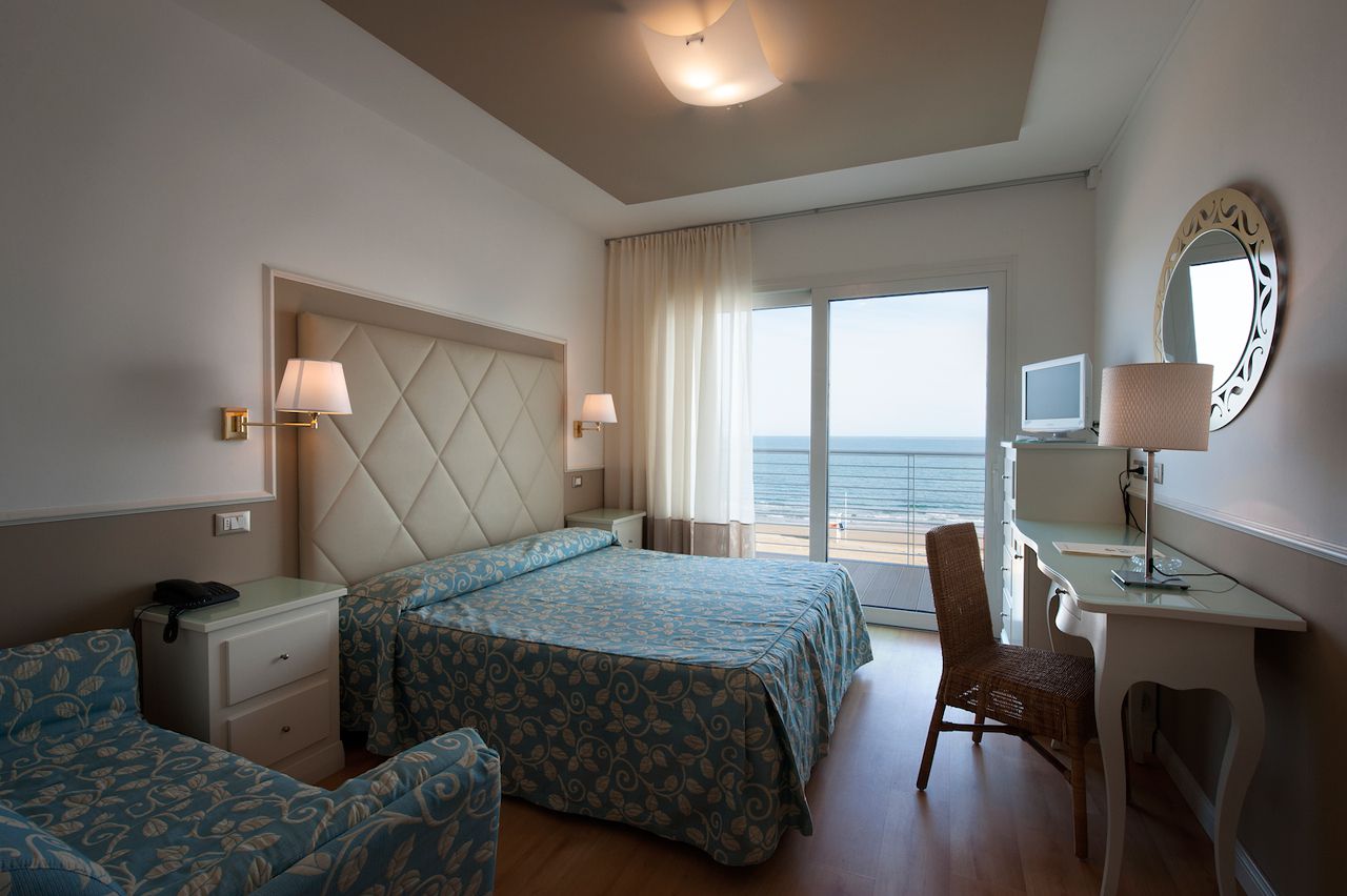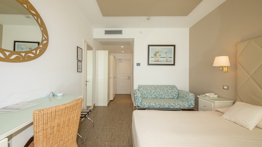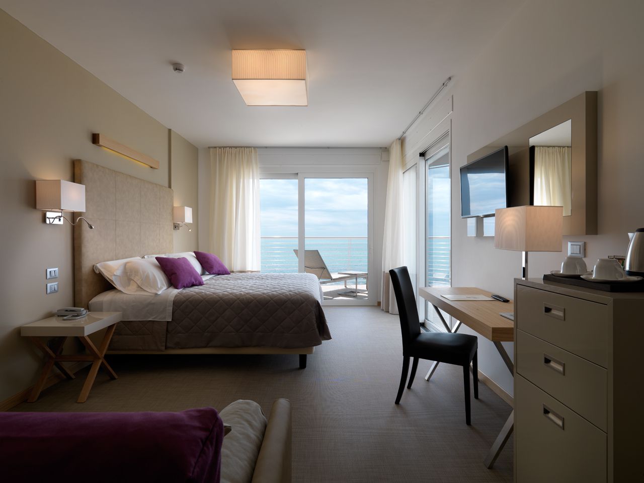 Camera doppia con divano ed ampio terrazzo con vista mare laterale; WIFI gratuito, aria condizionata, bagno privato con WC, doccia, phon, frigorifero, bollitore, cassaforte, TV-Sat