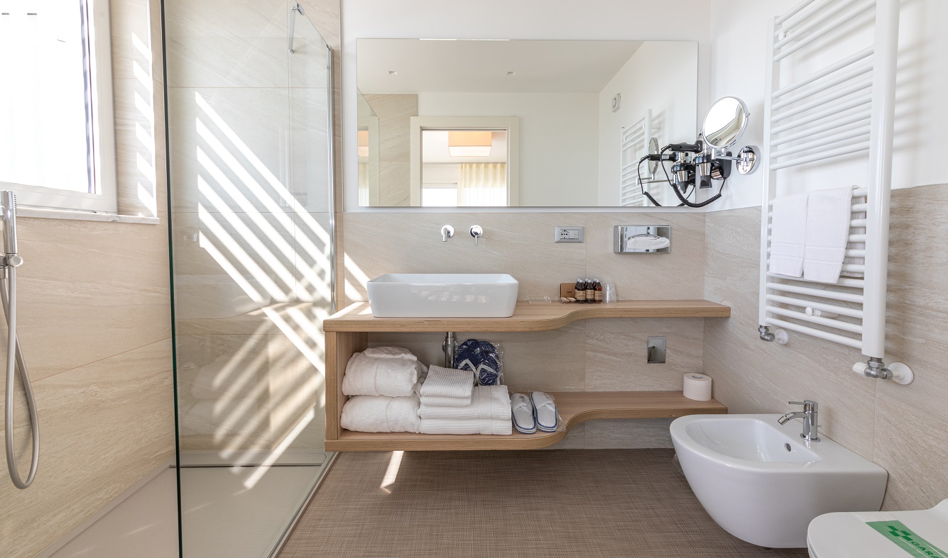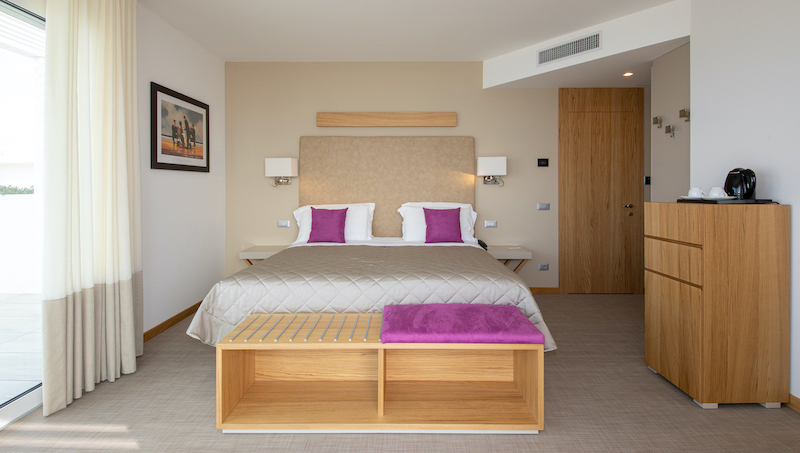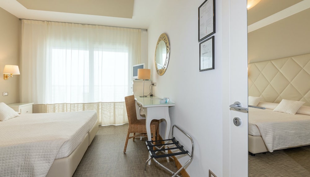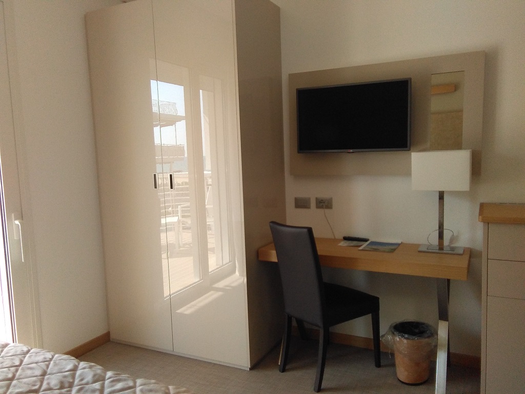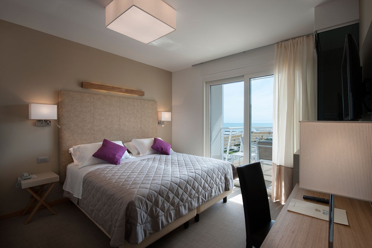 Camera doppia con divano ed ampio terrazzo con vista mare laterale; WIFI gratuito, aria condizionata, bagno privato con WC, doccia, phon, frigorifero, bollitore, cassaforte, TV-Sat