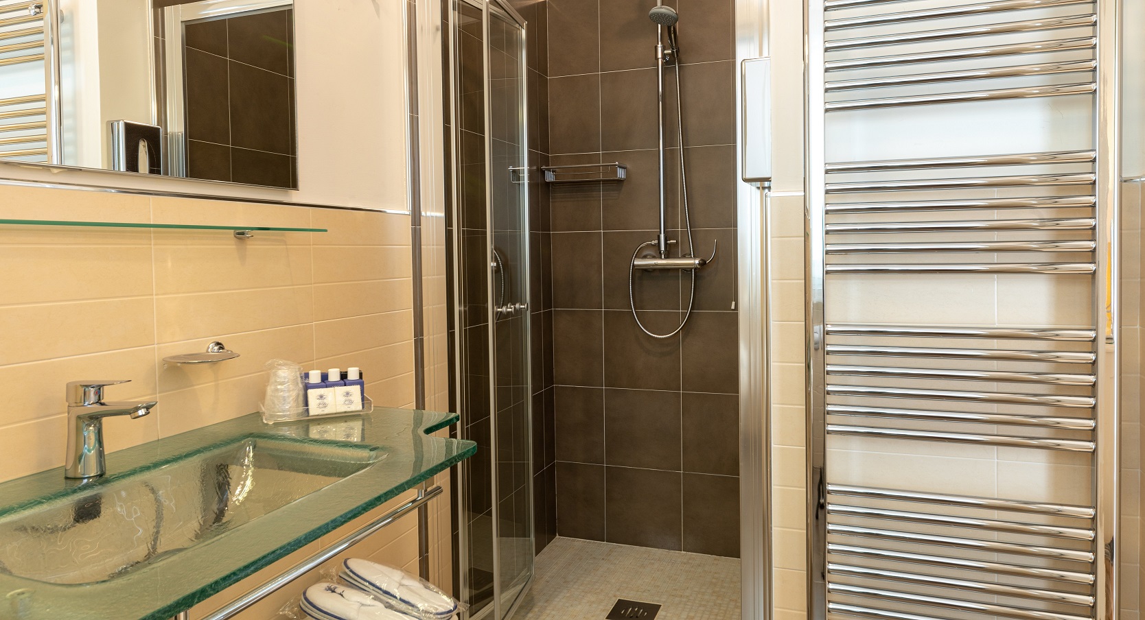 Camera doppia con divano; WIFI gratuito, aria condizionata, bagno privato con WC, doccia, phon, accappatoio, ciabatte, frigorifero, bollitore, cassaforte, TV-Sat