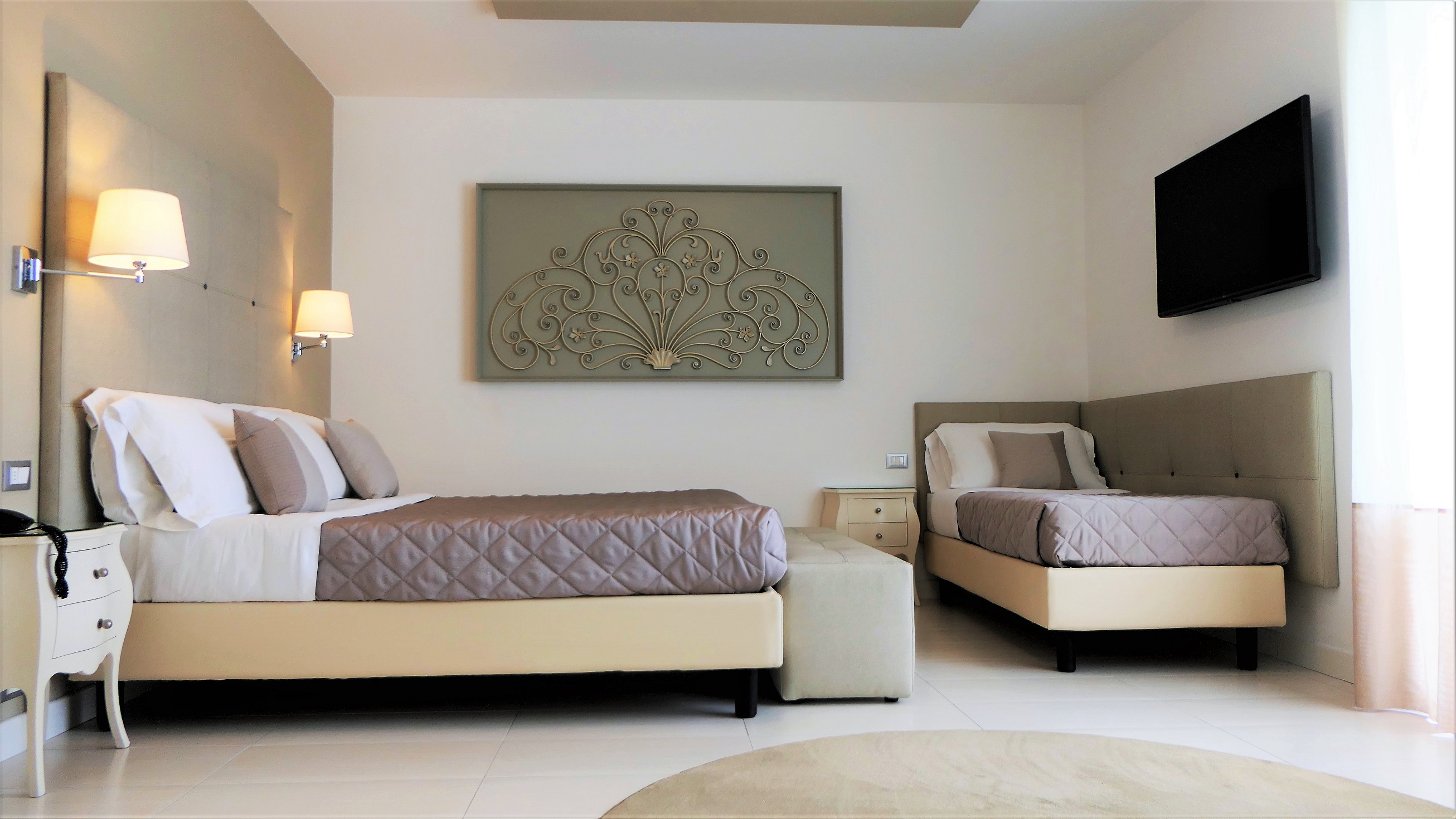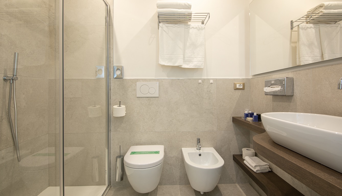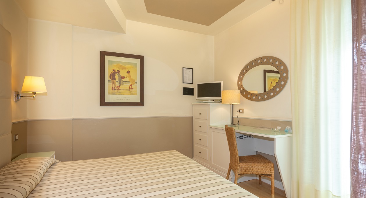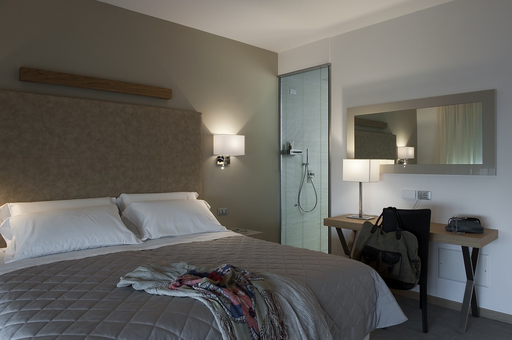 Camera doppia con divano letto matrimoniale; WIFI gratuito, aria condizionata, bagno privato con WC, doccia, phon, accappatoio, ciabatte, frigorifero, bollitore, cassaforte, TV-Sat