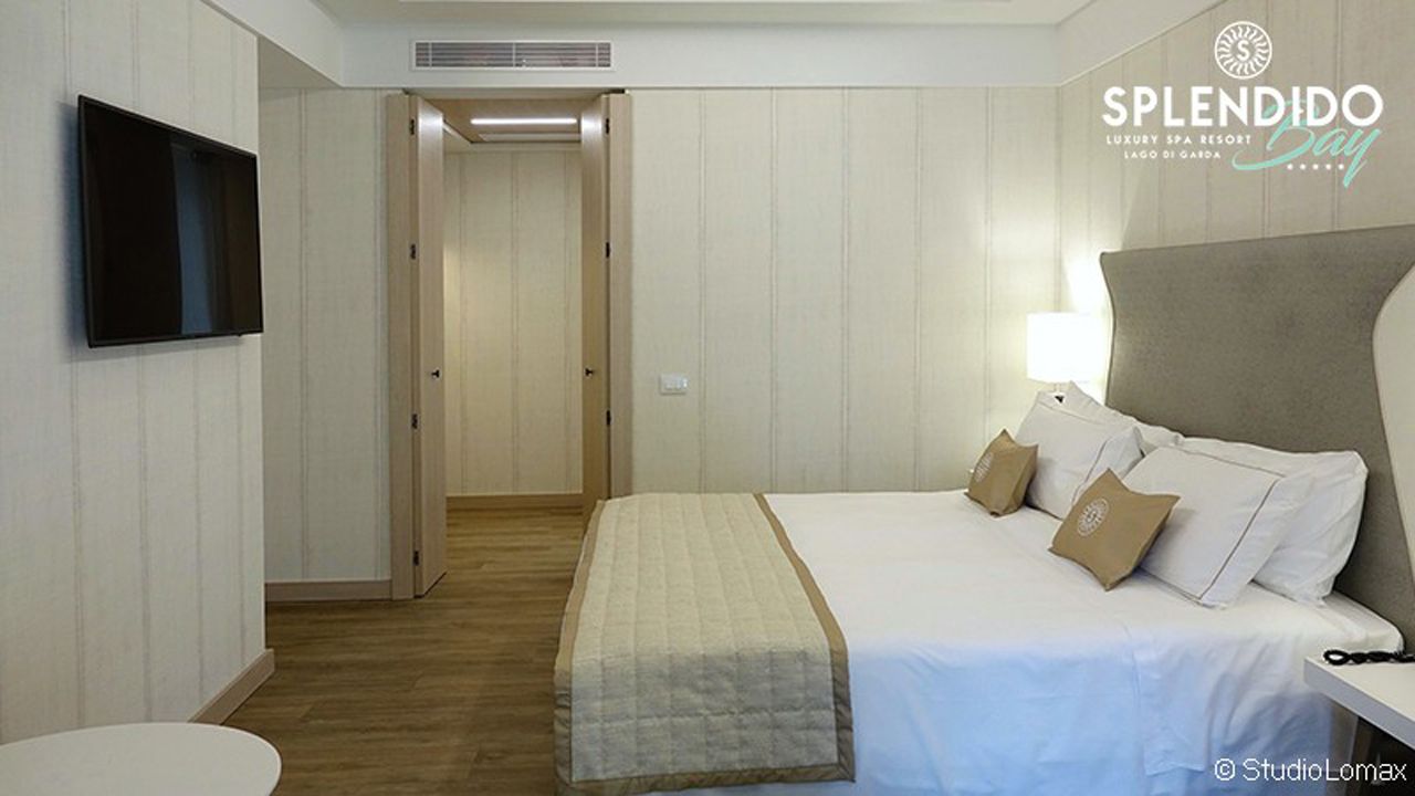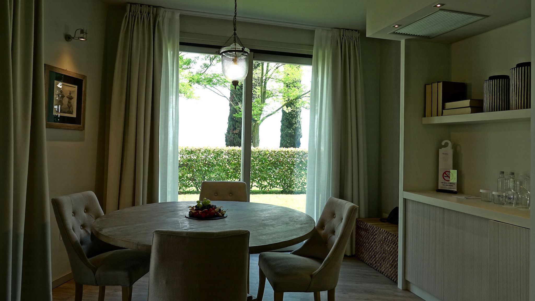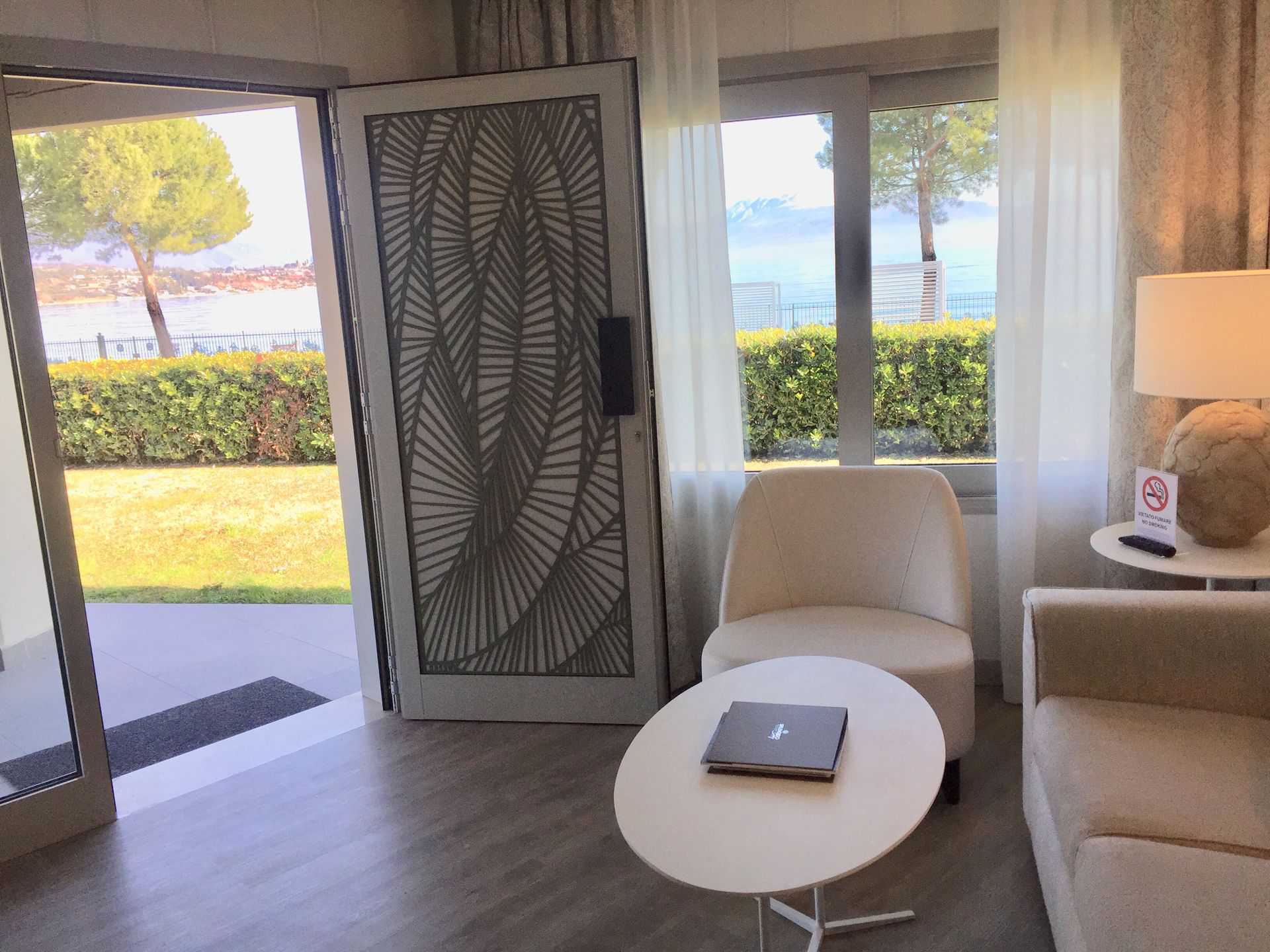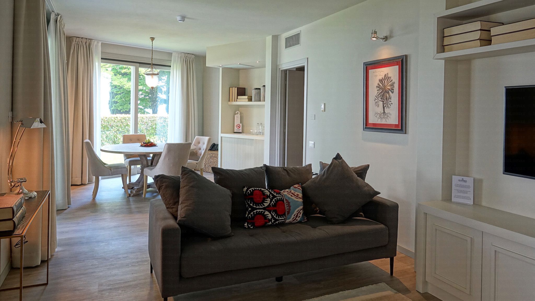Le Executive Suite sono dotate di due camere da letto con letto matrimoniale, due bagni, un comodo living/salottino con un sofà che all'occorrenza può trasformarsi in letto, Tv a schermo piatto, frigobar e macchina per caffè espresso. Le camere si trovano all'esterno nel nostro parco e sono dotate di un portico con giardino, per godere della vista sul lago, comodamente seduti sulle poltrone.