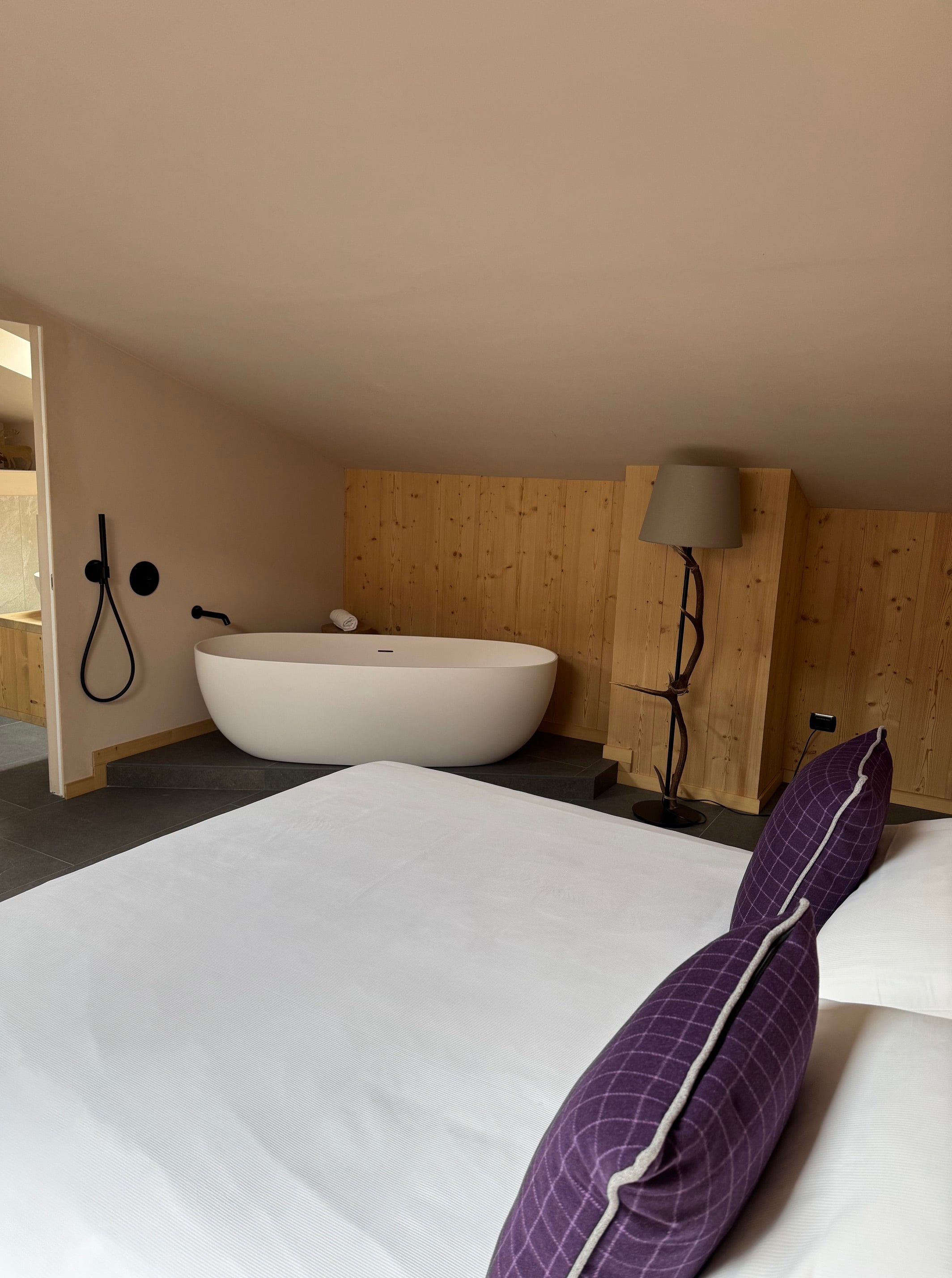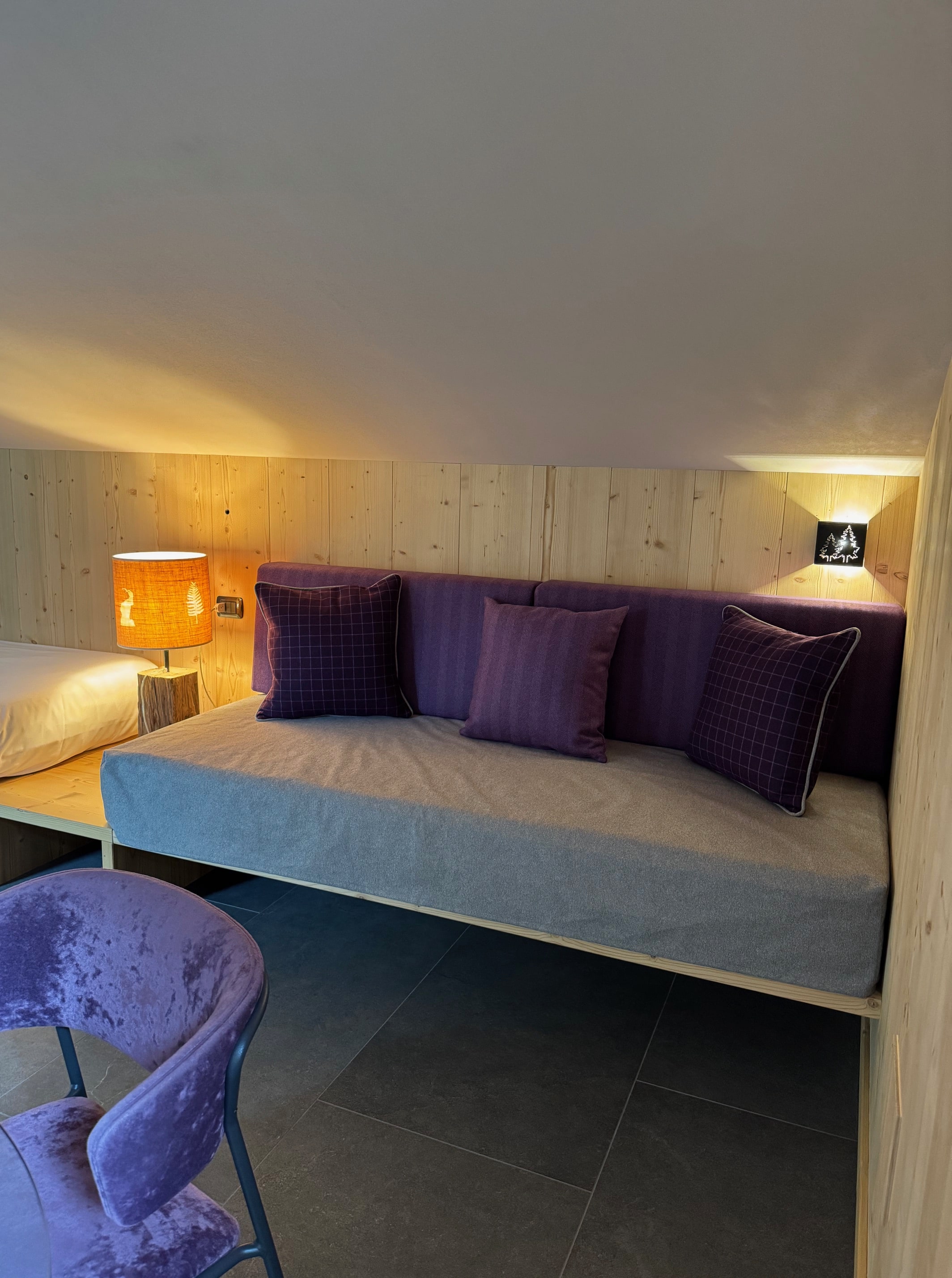 The bedroom has bright dormer windows offering views of the beautiful snow-capped mountains in winter and a dreamlike panorama in summer.