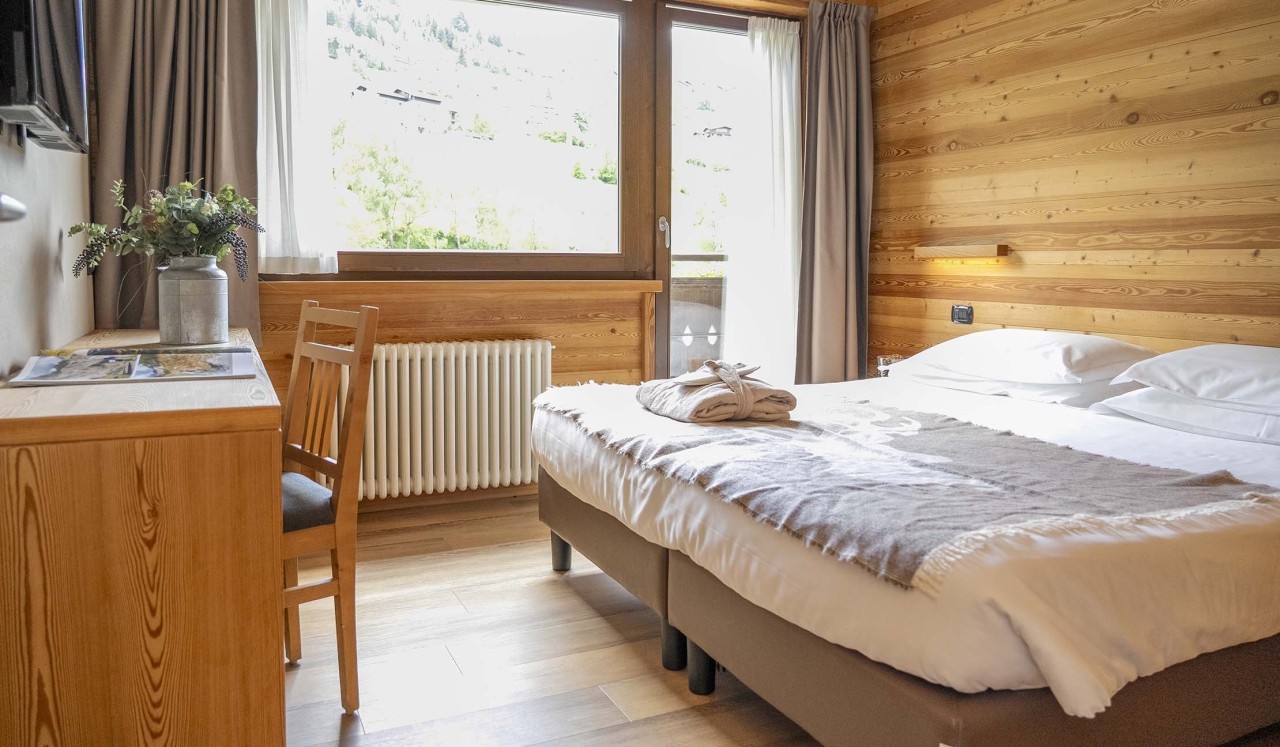 Our Standard rooms are warm and cosy, designed to offer a pleasant and relaxing stay. Located overlooking the quiet centre of Bormio or towards the ski slopes, these rooms combine comfort and practicality.