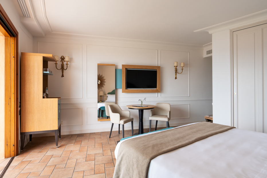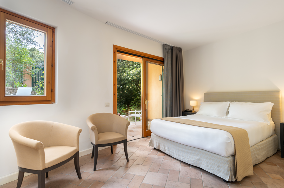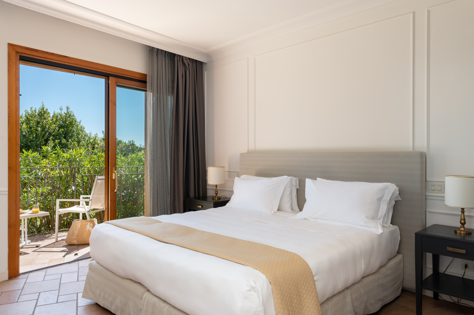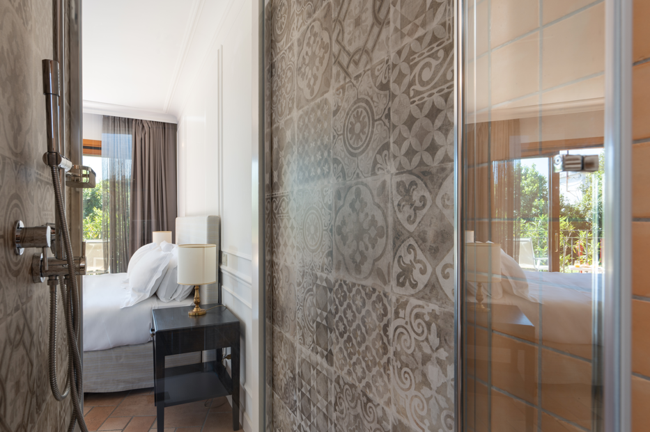 Ampia camera di 32 Mq, letto matrimoniale o due letti singoli, vista mare parziale e sul giardino e piccolo fabbricato, arredamento classico, bagno classico con larga doccia Grohe "effetto pioggia" con vetrata sulla camera e vista mare, vanity set firmato Comfort Zone, WiFi free, TV LCD, aria condizionata, Minibar Free, Bollitore con tè e caffè, Cassaforte.