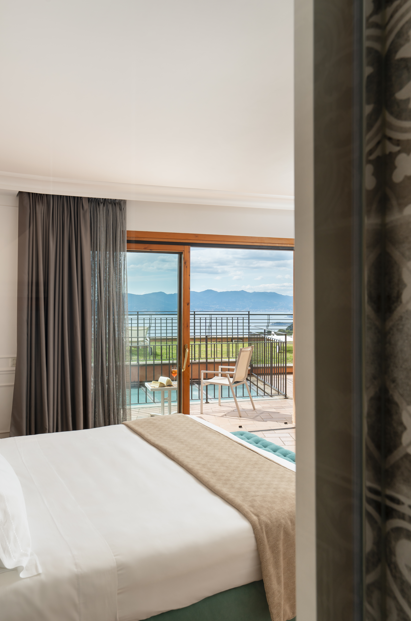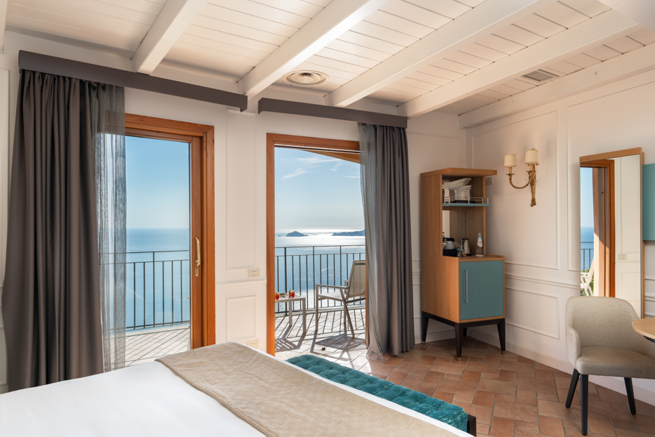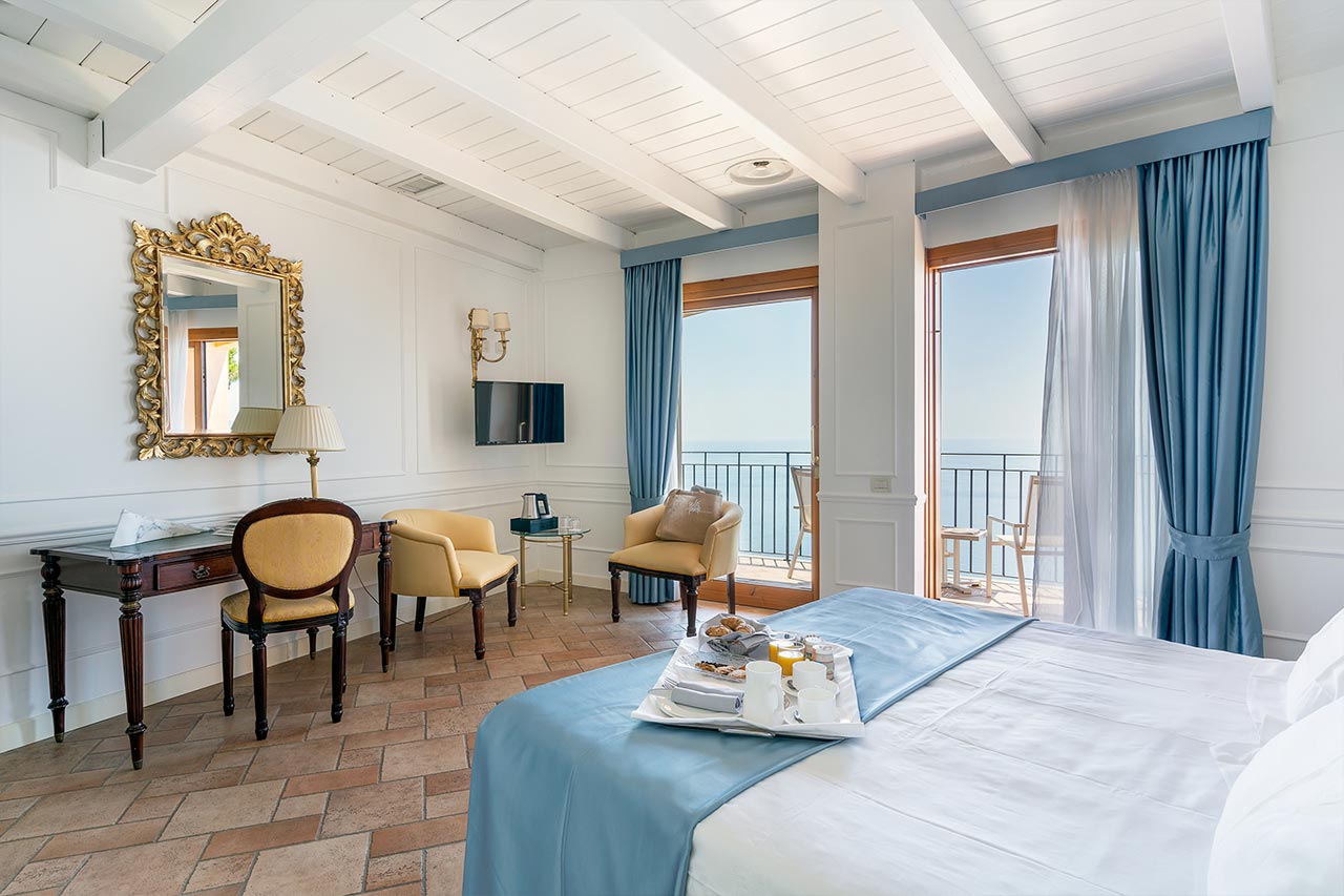 Ampia e luminosa camera di 29 Mq al piano 2°, letto matrimoniale da 190 cm,vista mare totale mozzafiato, terrazza privata, arredamento classico, bagno classico con ampia doccia Grohe "effetto pioggia" con vetrata sulla camera e sul mare, vanity set firmato Comfort Zone, WiFi free, TV LCD, aria condizionata insonorizzata, Minibar Free, Bollitore con tè e caffè, Cassaforte