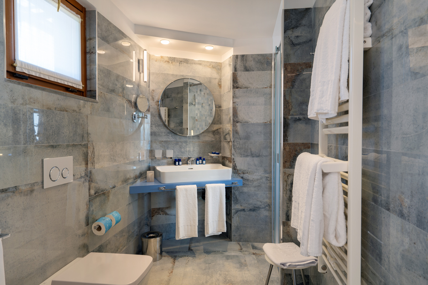 Ampia e luminosa suite al piano terra con accesso privato dall’esterno e vista a strapiombo sul mare, giardino privato, zona living con affaccio sulla bow window, letto matrimoniale, ampio bagno con doccia a vetri con affaccio sulla camera. Una delle due junior suite è predisposta per accogliere fino a 4 persone grazie a due letti singoli a scomparsa posizionati in una stanza separata da una parete di vetro e ad una comoda doccia doppia da 240 cm; l’altra può accogliere 3 persone grazie alla comoda chaise longue e alla doccia da 160 cm. Le camere sono dotate di tutti i comfort, vanity set firmato Comfort Zone e di insonorizzazione.