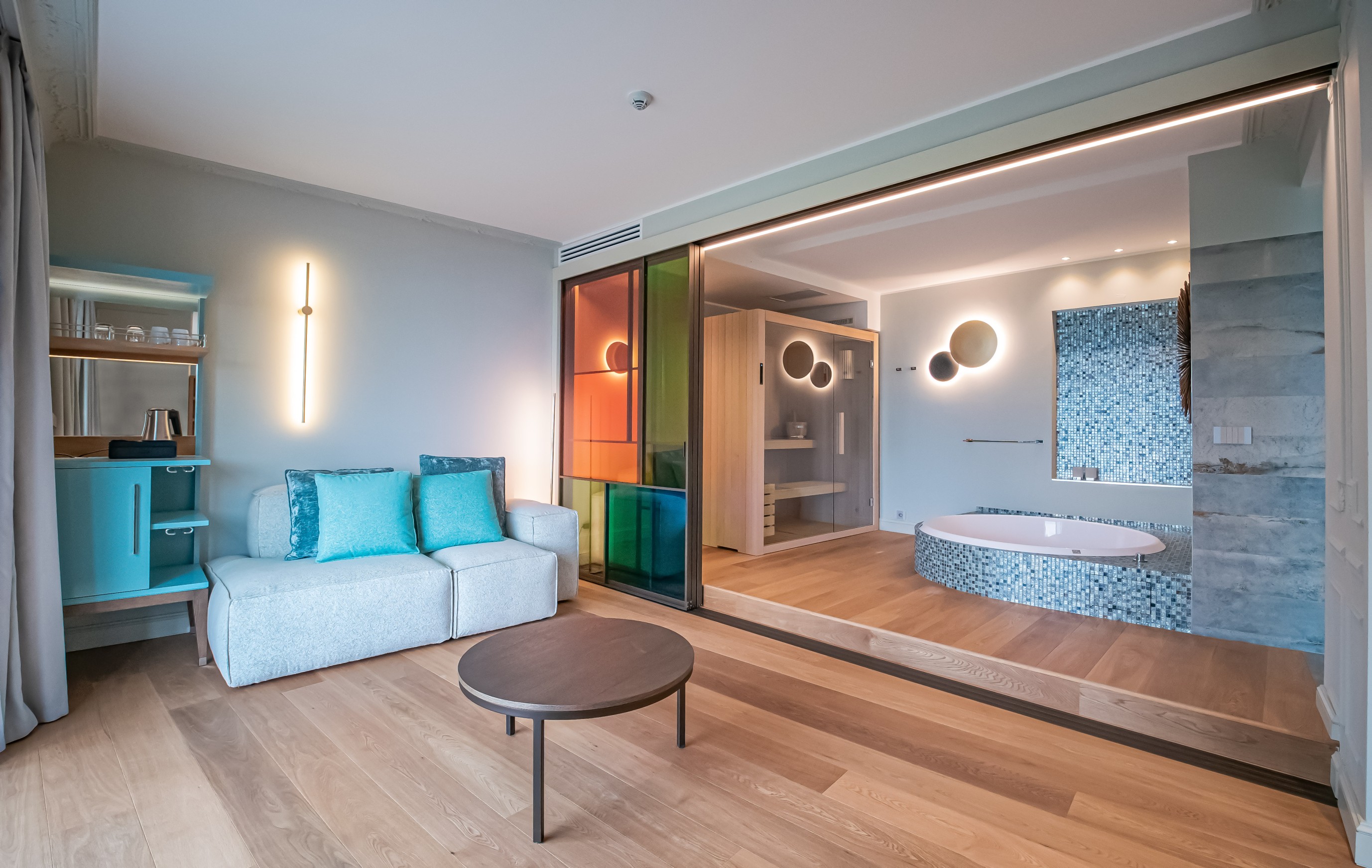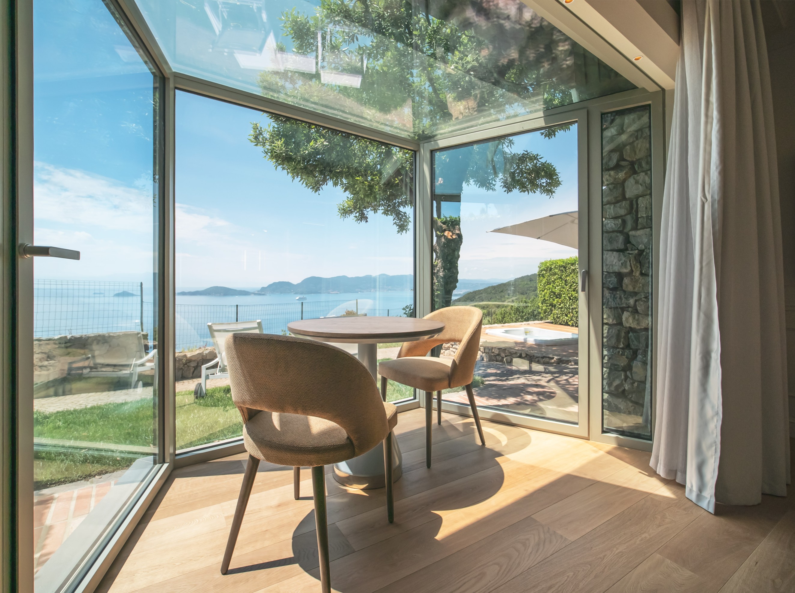 Due suite esperienziali con accesso privato dall’esterno, living interno affacciato sulla bow window e zona living nel giardino privato di 30 mq al piano terra. Le due Experience Deluxe Suite sono dotate di ogni comfort e insonorizzazione, dispongono di un letto matrimoniale, di una mini piscina riscaldata situata all’esterno con vista mozzafiato sul mare, 2 sedute lounge e 26 getti massaggianti. La private Spa interna con affaccio sulla camera è composta da: sauna finlandese 250x160 cm 90°/95° e 15% umidità, doccia a vista lunga 210 cm con 3 soffioni verticali e un soffione 38x38 cm effetto pioggia, vasca air pool da 160 cm di diametro, 24 iniettori, massaggio micro diffuso e velocità regolabile.