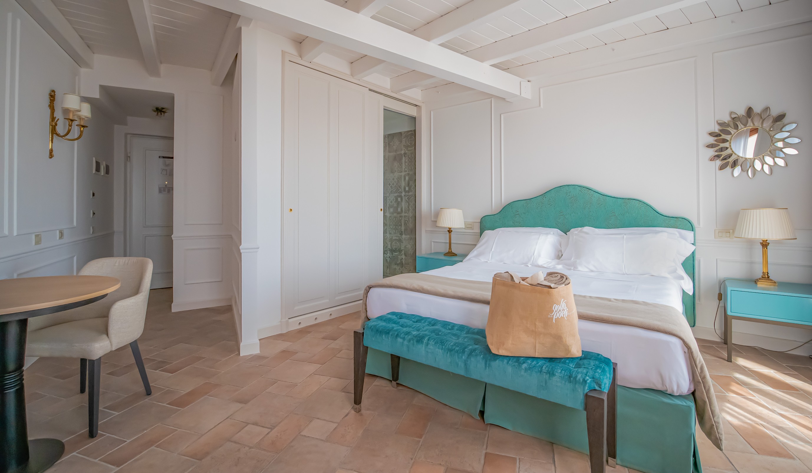 La nostra camera Seducente vi colpirà per l'incanto delle sue nuove forniture, il parquet in legno e una meravigliosa vasca jacuzzi 185x110x75 con 22 getti idromassaggio posizionata sul terrazzo con vista sul Golfo dei Poeti. Ampio bagno con doccia a vista e vanity kit Comfort Zone.